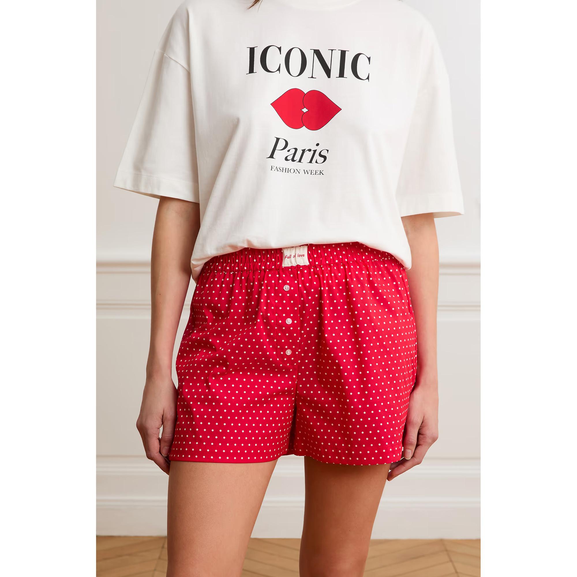Ce short de pyjama présente un motif à pois ludique, offrant une option confortable et élégante pour les vêtements de détente. Le design comprend une taille élastique pour un ajustement sûr et une patte de boutonnage pour un détail supplémentaire.