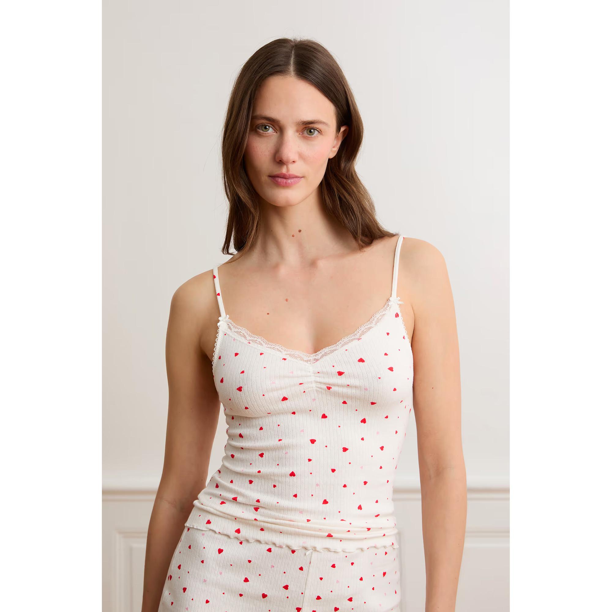 Ce top sans manches arbore un charmant imprimé cœurs, ajoutant une touche ludique à toute tenue. Le design comprend une délicate bordure en dentelle le long de l'encolure et de petits nœuds sur les bretelles, rehaussant son attrait féminin. Le top est confectionné avec une texture côtelée, offrant une coupe confortable et flatteuse.