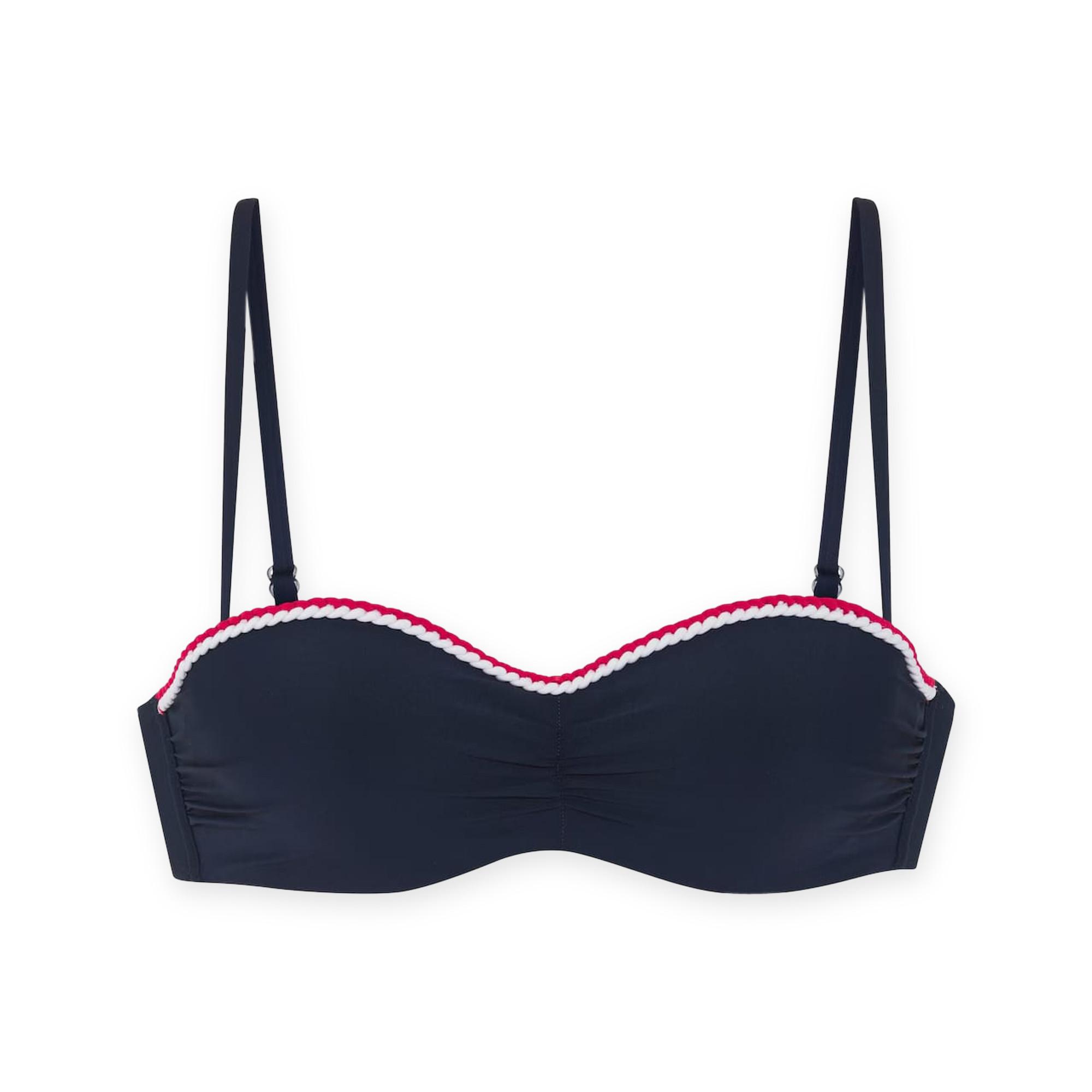 Ce top bandeau présente un design renforcé, offrant à la fois style et maintien. Le top est orné d'une bordure décorative le long de l'encolure, ajoutant une touche d'élégance à sa silhouette classique. Il comprend des bretelles réglables et amovibles, permettant des options de style polyvalentes.