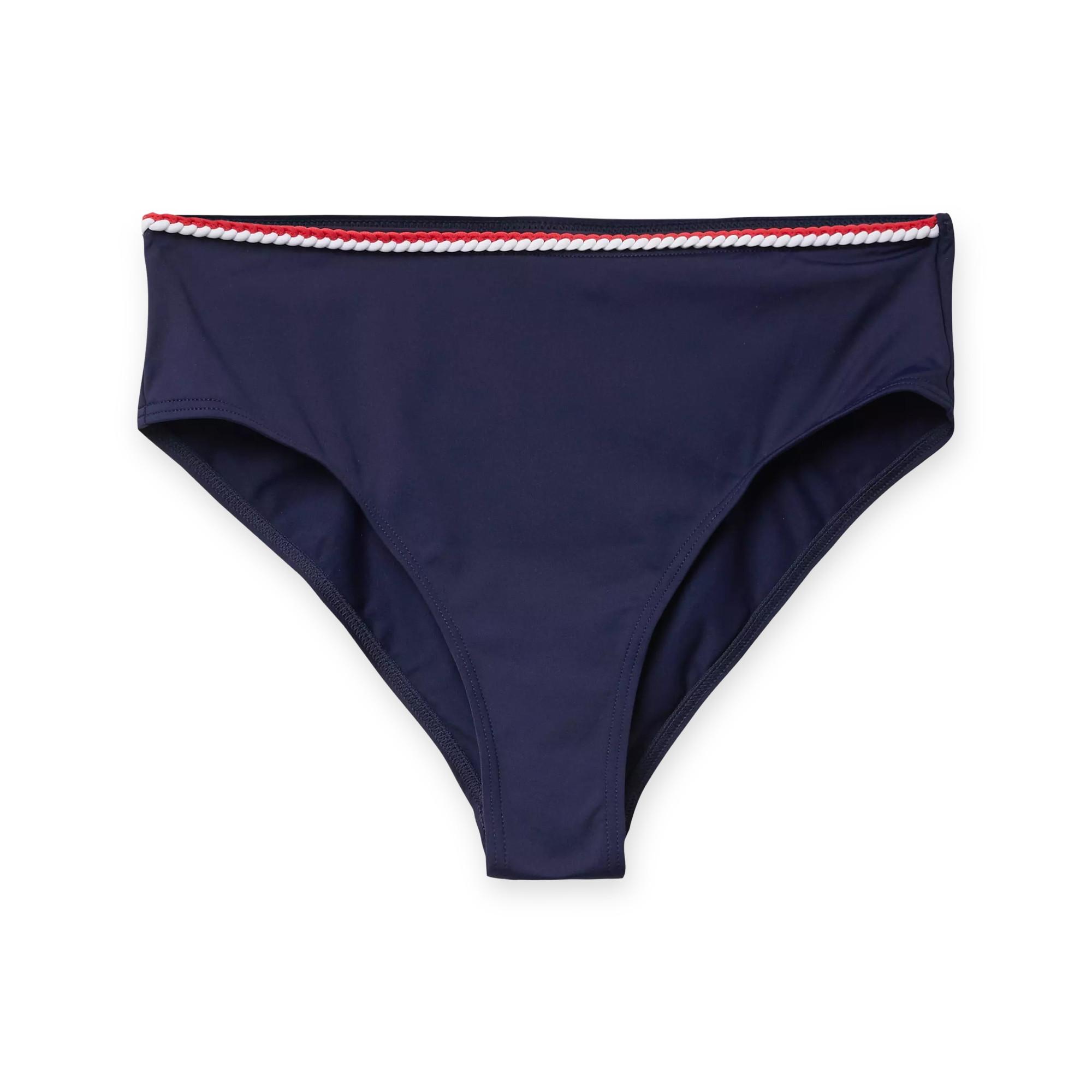 Ce bas de bikini présente une coupe culotte classique, offrant une silhouette confortable et intemporelle. Le design est rehaussé d'une bordure décorative le long de la ceinture, ajoutant une touche de style nautique.