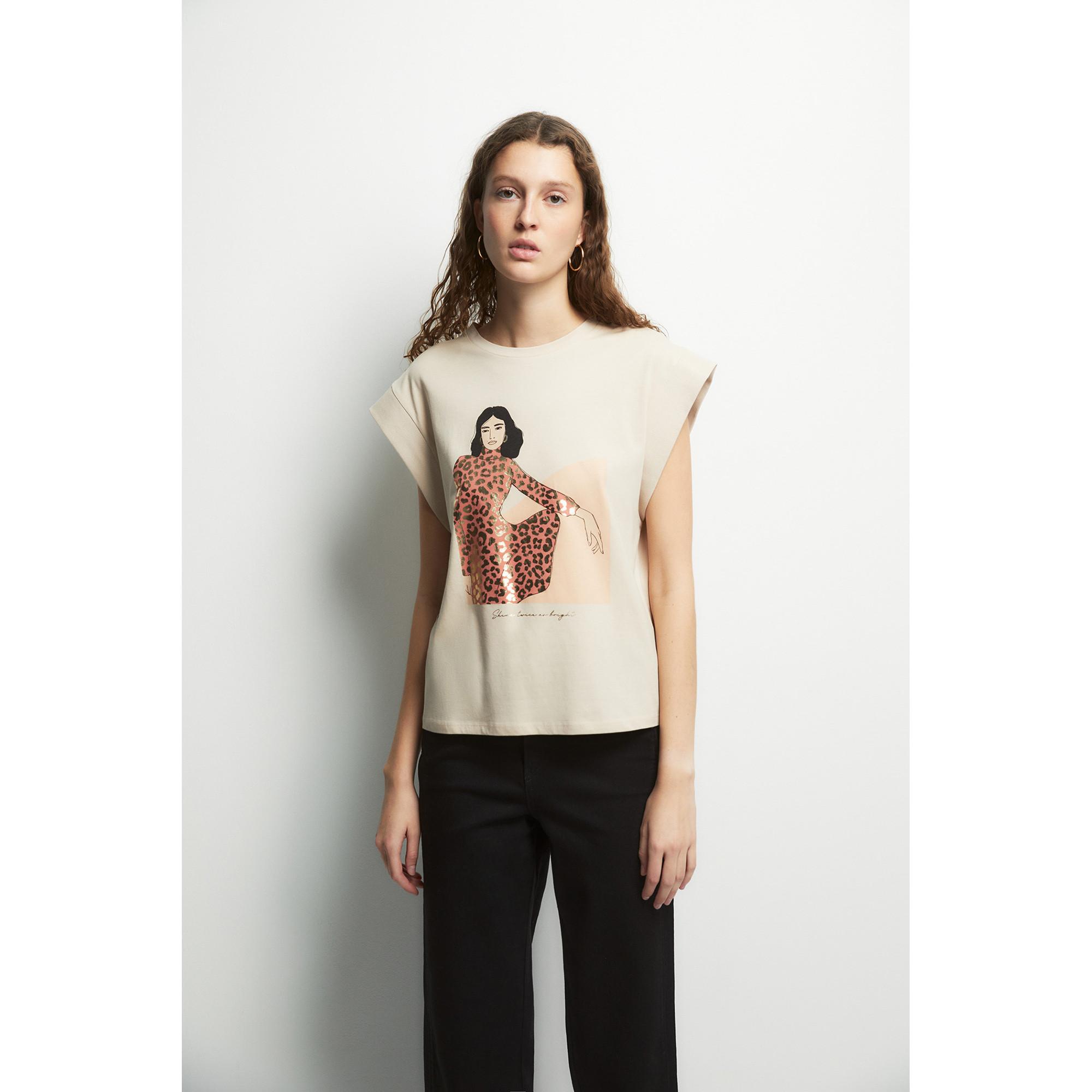 Ce T-shirt présente une encolure ronde et des manches courtes avec un revers retroussé. Le devant est orné d'un imprimé métallique saisissant, ajoutant une touche de brillance au vêtement. Le dos du T-shirt est uni, offrant un contraste équilibré avec le devant orné.