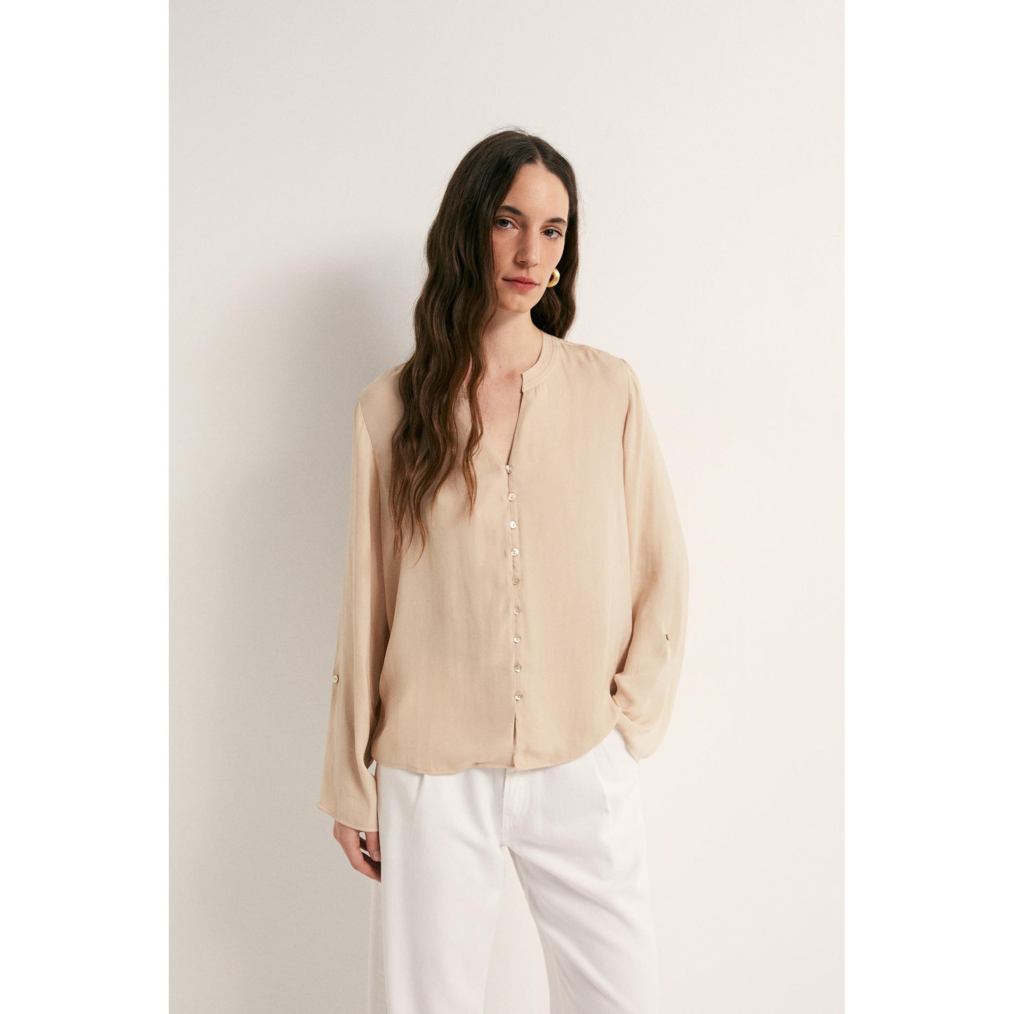 Ce chemisier à manches longues présente un col en V classique et une patte de boutonnage, offrant un look polyvalent et élégant. Son design le rend adapté à diverses occasions, des sorties décontractées aux cadres plus formels.