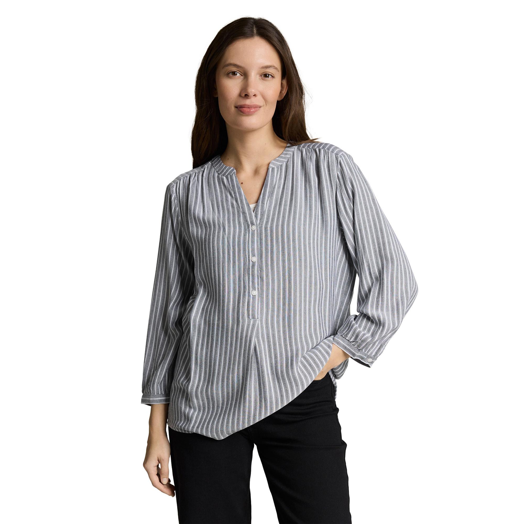 Ce chemisier présente un motif rayé classique, offrant un ajout polyvalent à toute garde-robe. Le design comprend un col en V et des manches 3/4 avec des poignets boutonnés, assurant une coupe confortable et élégante.