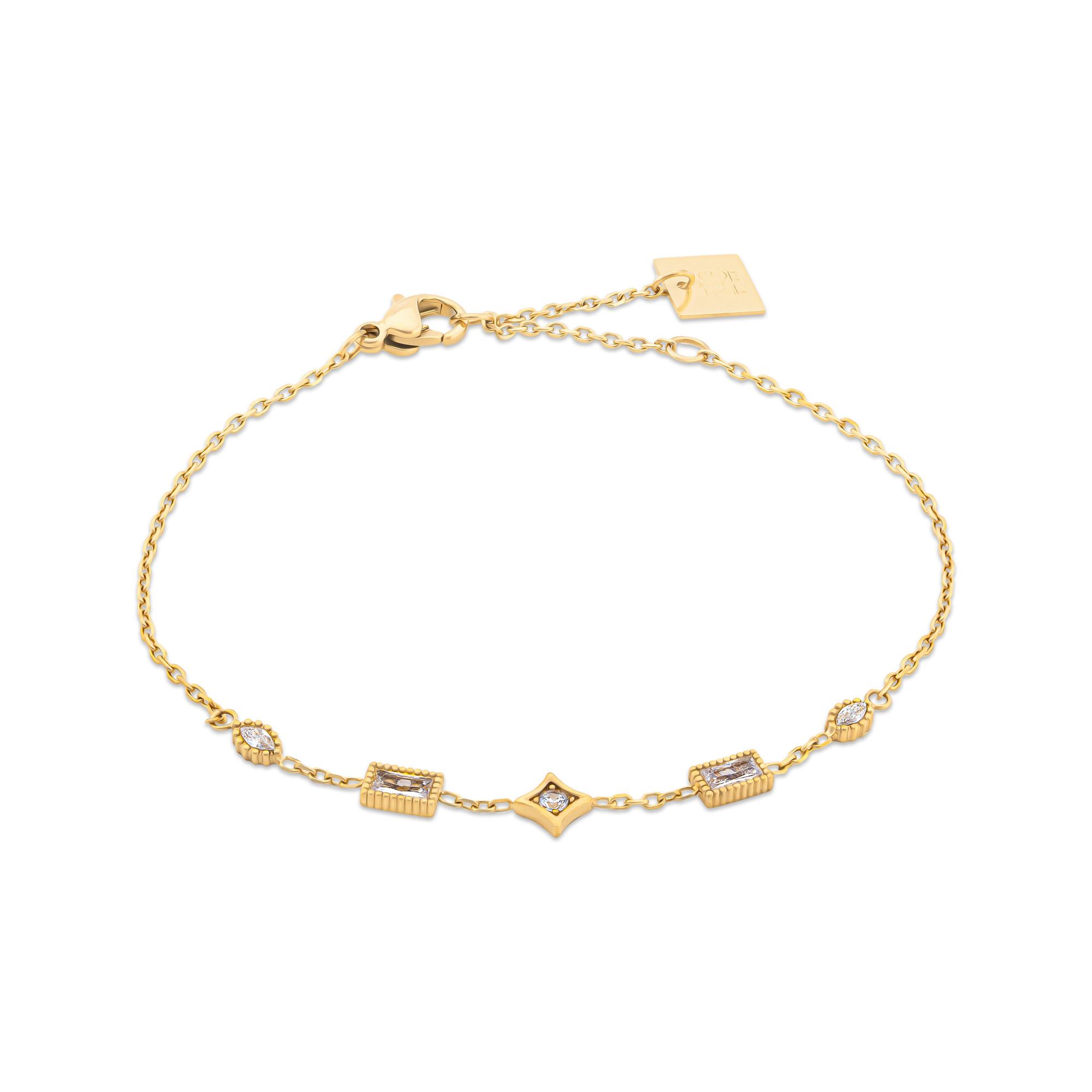 Cette gourmette de Zag Bijoux est un bijou à maillons fins avec un charme ludique. La chaîne est fabriquée en acier inoxydable doré avec des charms délicats en pierres décoratives à facettes. La chaîne réglable en largeur se ferme de manière élégante par un fermoir mousqueton.