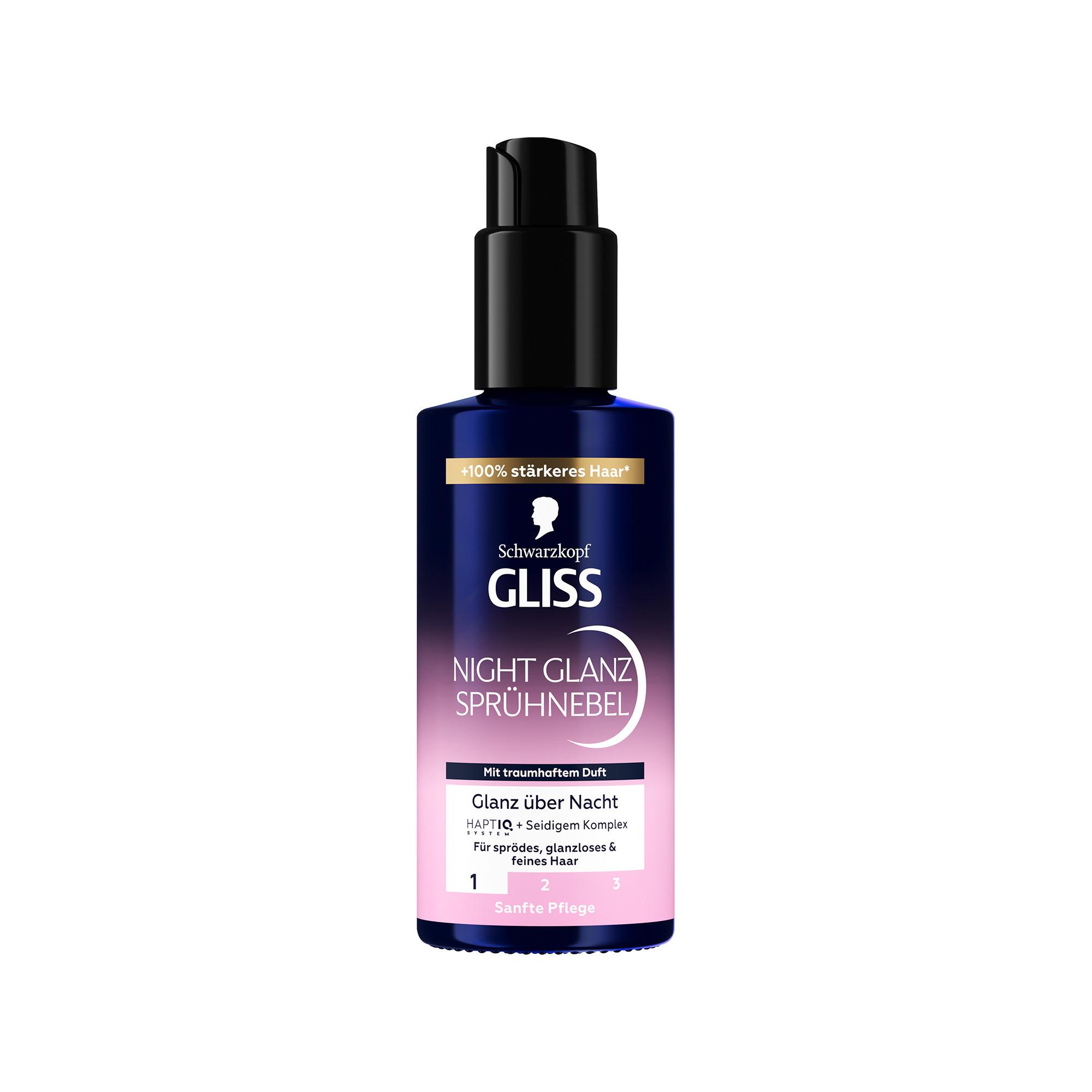 Brume légère – Le spray sans rinçage Gliss Night Brillance nourrit sans alourdir, idéal pour les cheveux fins.