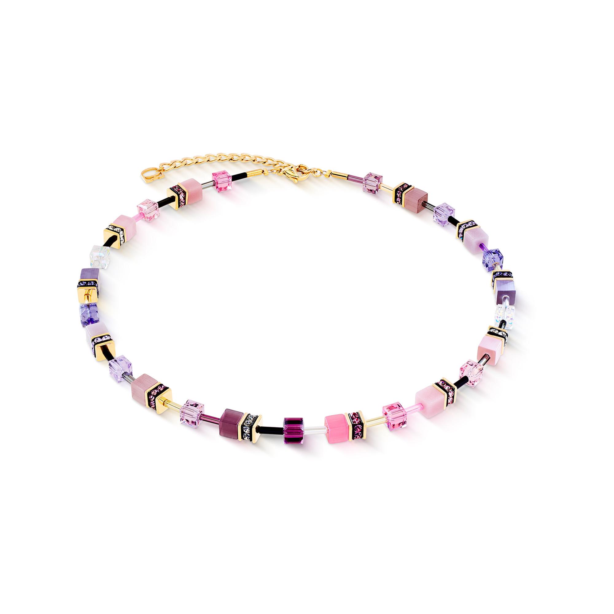 Le collier GeoCUBE® Iconic Rose‑Lilac de COEUR DE LION séduit par une composition de couleurs féminine et moderne, mêlant des tons rose et lilas doux à des accents dorés chaleureux. Des cristaux Swarovski® étincelants, de l œil de tigre synthétique et des cubes de verre colorés s associent dans le design emblématique GeoCUBE®. Les tailles précises offrent de brillants reflets lumineux, tandis que de fines rondelles en strass ajoutent une touche d élégance. Réalisé en acier inoxydable doré de haute qualité, ce collier se distingue par son confort et son style intemporel.