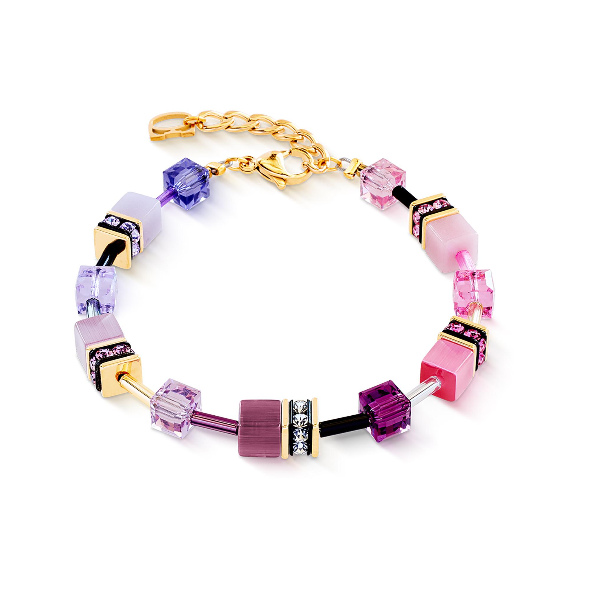 Le bracelet GeoCUBE® Iconic Pink‑Lilac de COEUR DE LION exprime avec élégance l harmonie raffinée des tons rose, lilas et pink. Des cristaux Swarovski® étincelants, de l œil de tigre synthétique et des cubes de verre colorés créent une interaction vibrante entre lumière, couleur et structure. Des tailles brillantes, des transitions de couleurs douces et des rondelles en strass apportent profondeur et éclat au design géométrique. Réalisé en acier inoxydable doré de haute qualité, ce bracelet séduit par son confort et sa qualité durable.