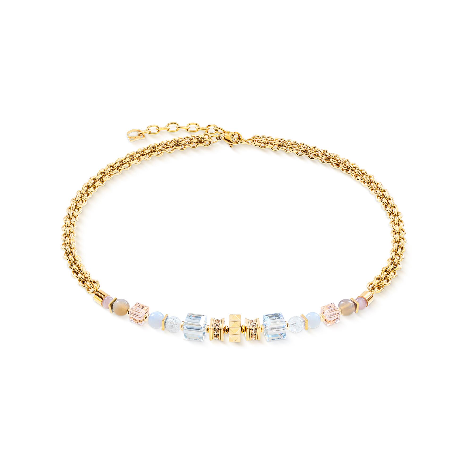 Le collier Cube Nexus gold‑pastel associe des tons pastel doux à une géométrie structurée pour un style moderne et léger. Des cubes de pierres fines et de délicates perles sont complétés par des cubes en cristal Swarovski® facettés, offrant de superbes reflets lumineux. Un élément central en forme de spike apporte une profondeur architecturale et un accent contemporain. La chaîne mesh épaisse renforce l allure affirmée du bijou, idéal aussi bien au quotidien qu pour les occasions spéciales.