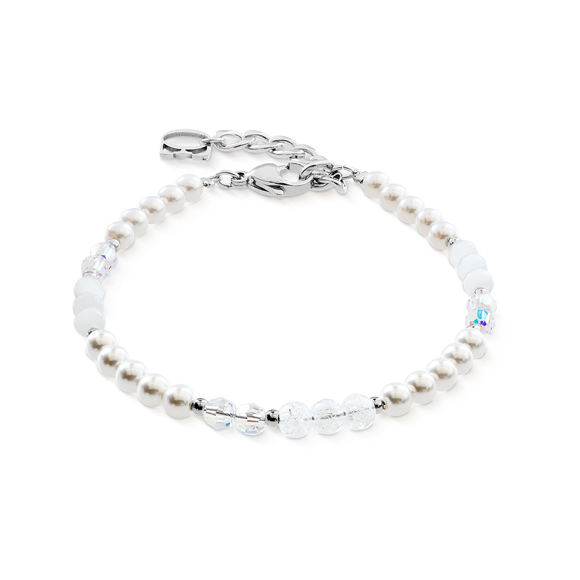 Le bracelet Princess Rhythm silver‑white séduit par sa clarté et son élégance discrète. Les Crystal Pearls by Swarovski® lumineuses s associent à des cristaux Swarovski® scintillants, des détails argentés frais et de subtils accents en hématite. L arrangement rythmique crée un mouvement calme et harmonieux autour du poignet. Un bijou intemporel, facile à combiner ou à porter en parure avec la ligne Princess Rhythm.