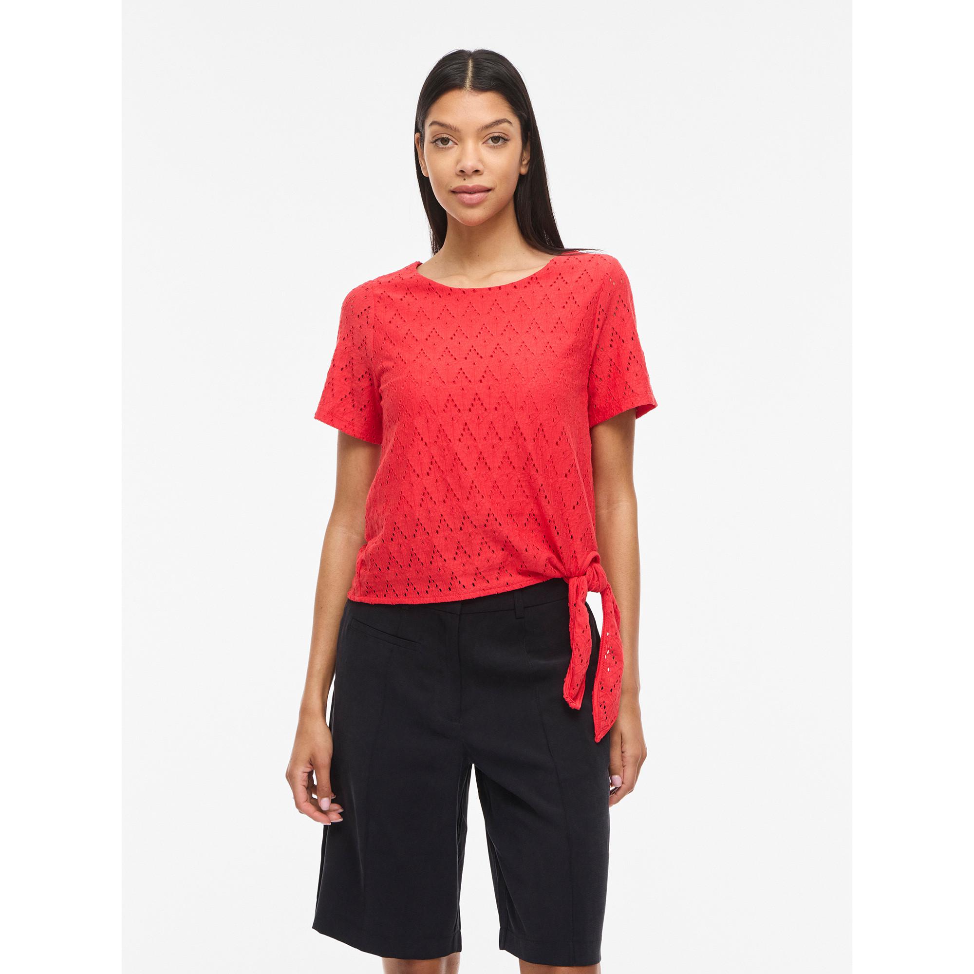 Ce chemisier à manches courtes présente un délicat motif perforé sur l'ensemble, offrant un design élégant et respirant. L'encolure ronde procure un look classique, tandis que le détail à nouer à l'ourlet ajoute un élément ludique et ajustable à la silhouette.