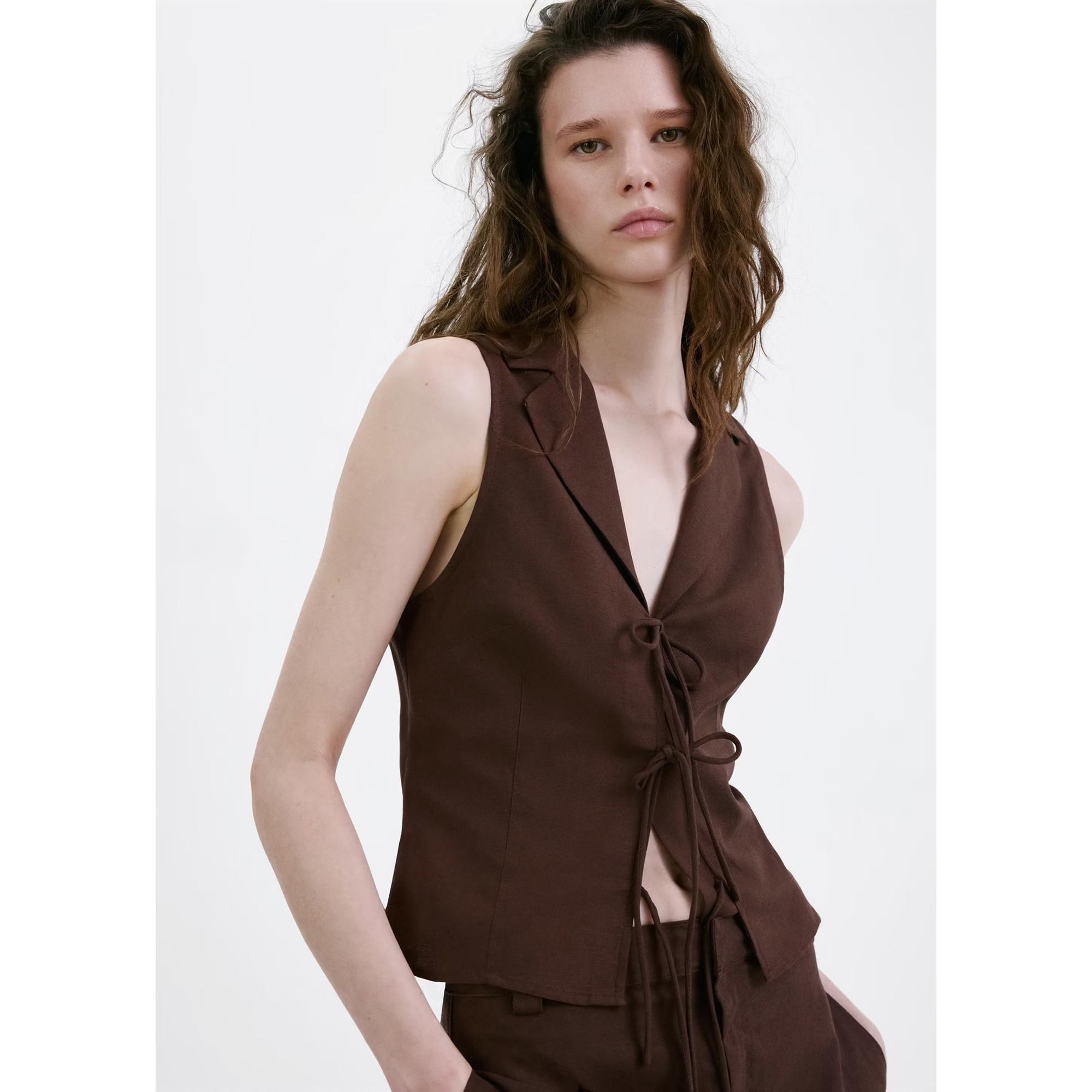 Ce chemisier sans manches présente un décolleté en V élégant et une fermeture à nouer unique sur le devant, permettant un ajustement personnalisable. Le design est à la fois moderne et polyvalent, ce qui le rend adapté à diverses occasions.