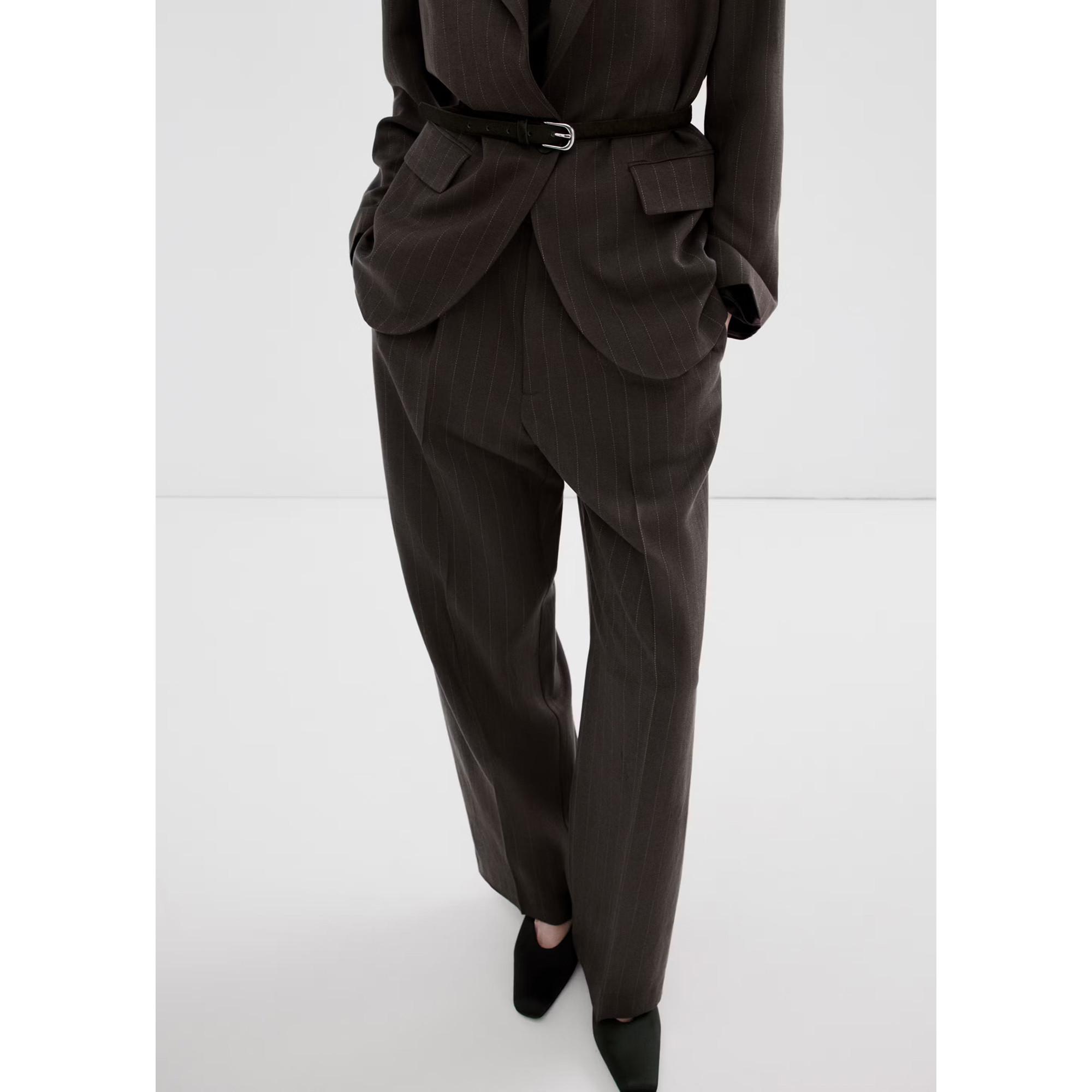 Ce pantalon présente un motif classique à fines rayures, offrant un look sophistiqué et intemporel. Le design inclut une coupe confortable, le rendant adapté à diverses occasions.