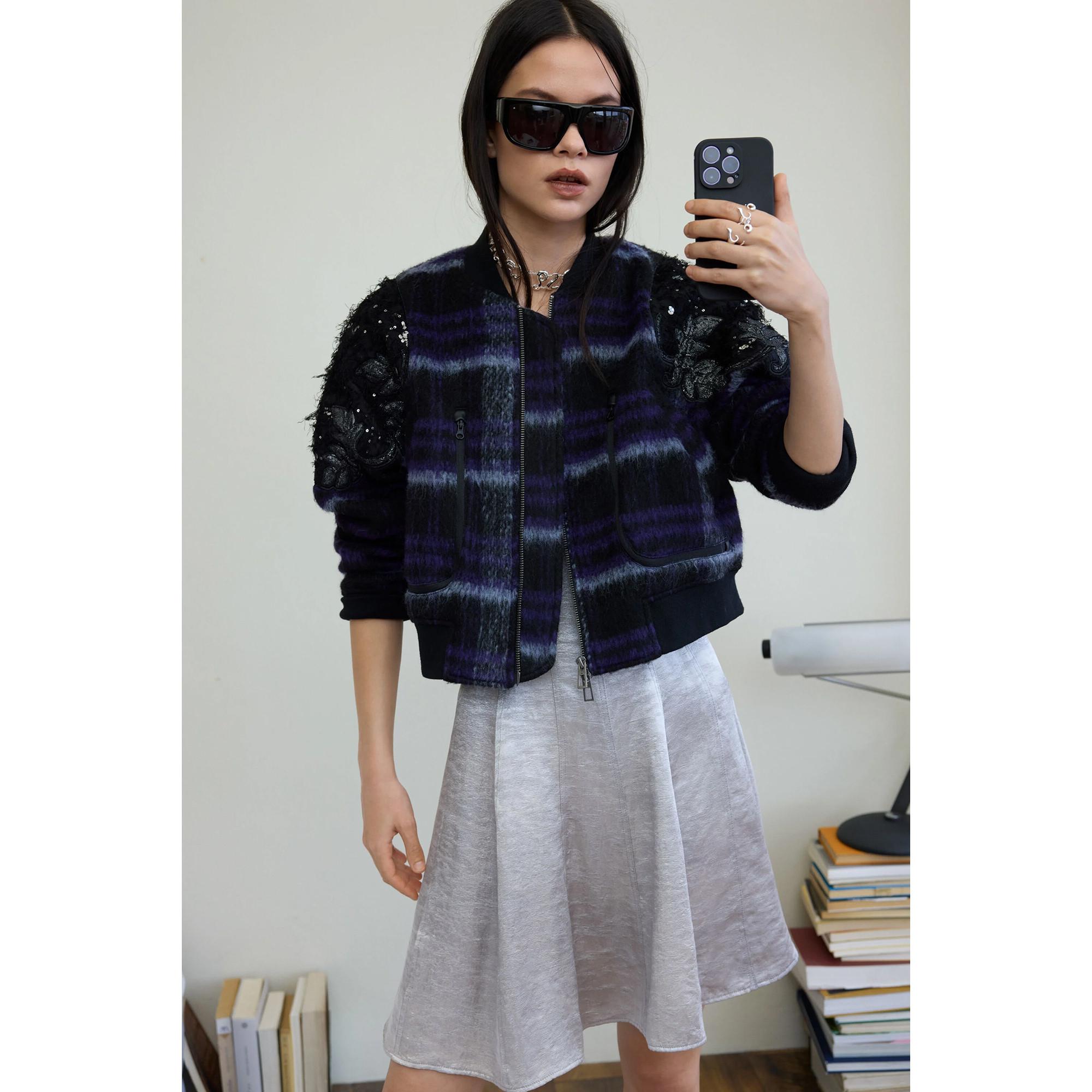 Ce blouson bomber présente un motif à carreaux élégant, offrant un look contemporain. Le design est rehaussé d'ornements en paillettes sur les épaules et les manches, ajoutant une touche d'éclat et de texture. La veste est conçue avec une fermeture éclair intégrale pour un enfilage facile et une coupe régulière confortable.
