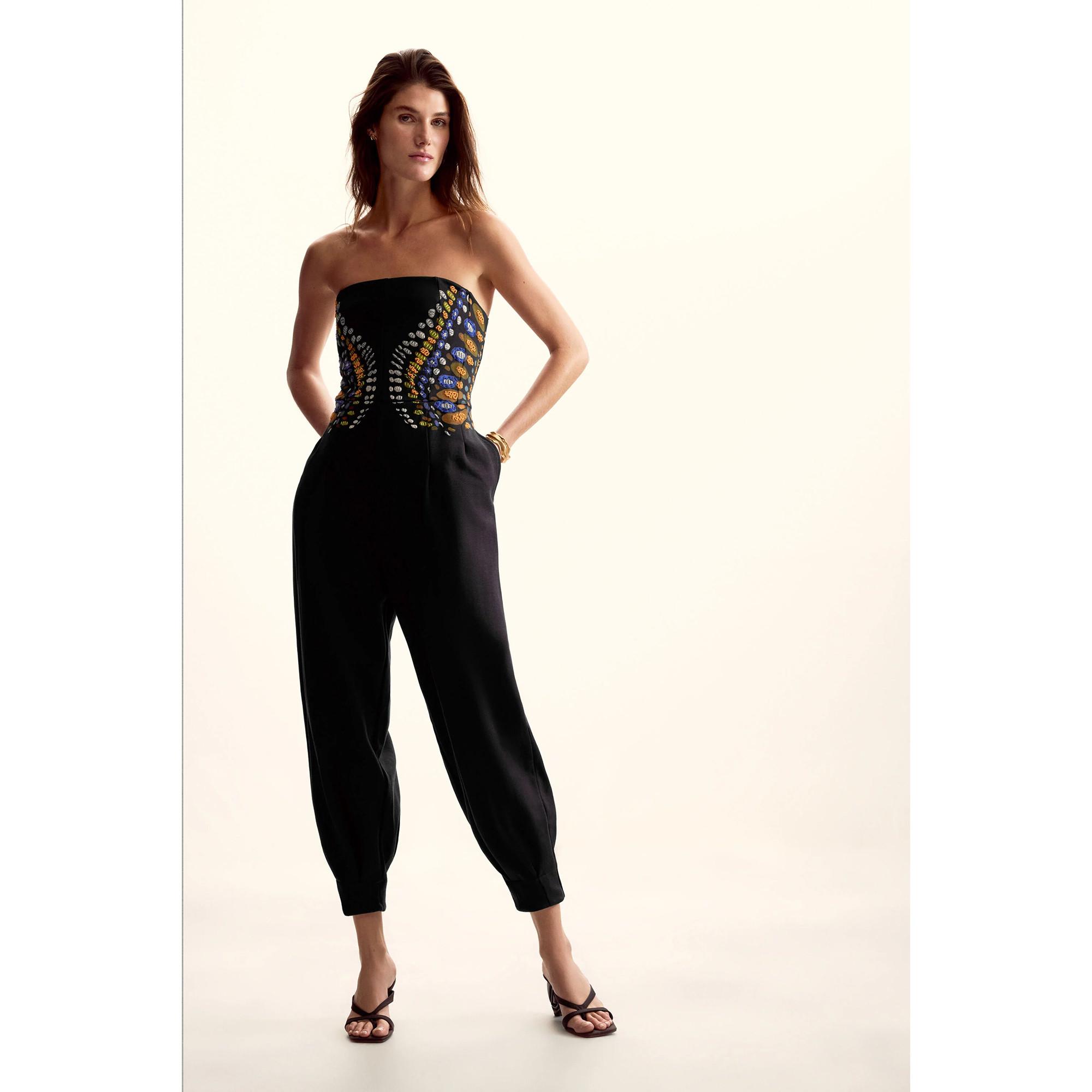 Cette élégante combinaison présente un design bustier avec un corsage magnifiquement brodé, offrant une silhouette sophistiquée et moderne. La broderie complexe ajoute une touche artistique et colorée au design noir classique. La coupe décontractée du pantalon assure le confort tout en conservant une apparence chic, ce qui la rend adaptée à diverses occasions.