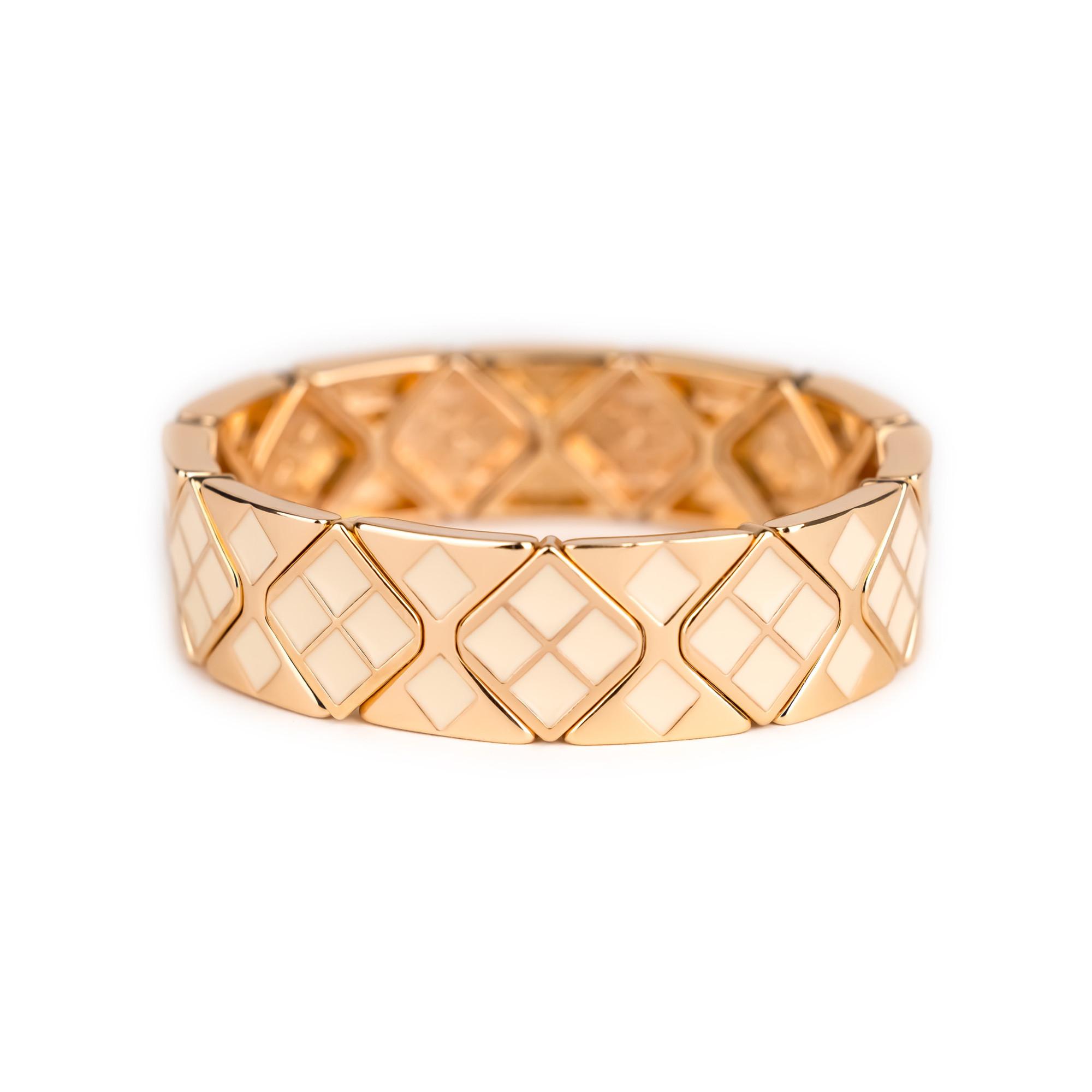 Le bracelet Prism évoque un instant d’été calme et apaisant, à la beauté pure. Réalisé en métal émaillé, il associe des perles colorées à une finition dorée au motif de losanges, formant une mosaïque graphique raffinée. Porté comme un jonc, il se prête aussi bien à un porté seul qu’à une accumulation façon manchette. Son élastique unibrin assure confort et durabilité, la taille Petit pouvant toutefois tailler légèrement plus petit.