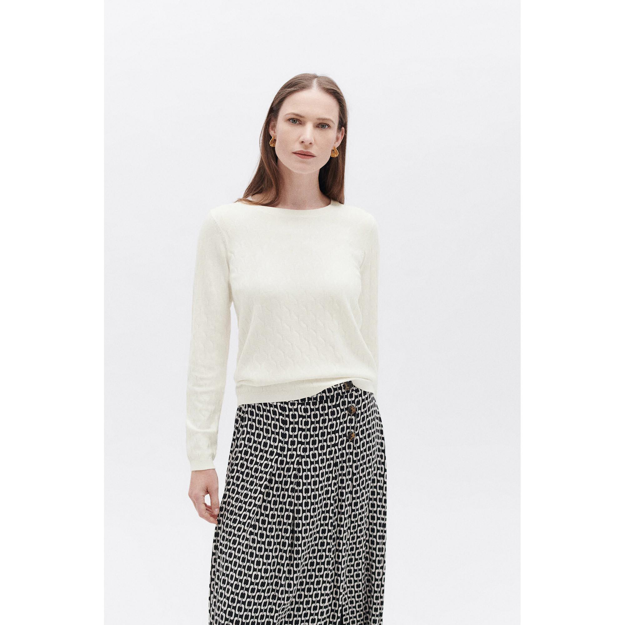 Ce pull présente un col rond classique et des manches longues, ce qui en fait un ajout polyvalent à toute garde-robe. Son design offre une coupe régulière confortable pour diverses occasions.