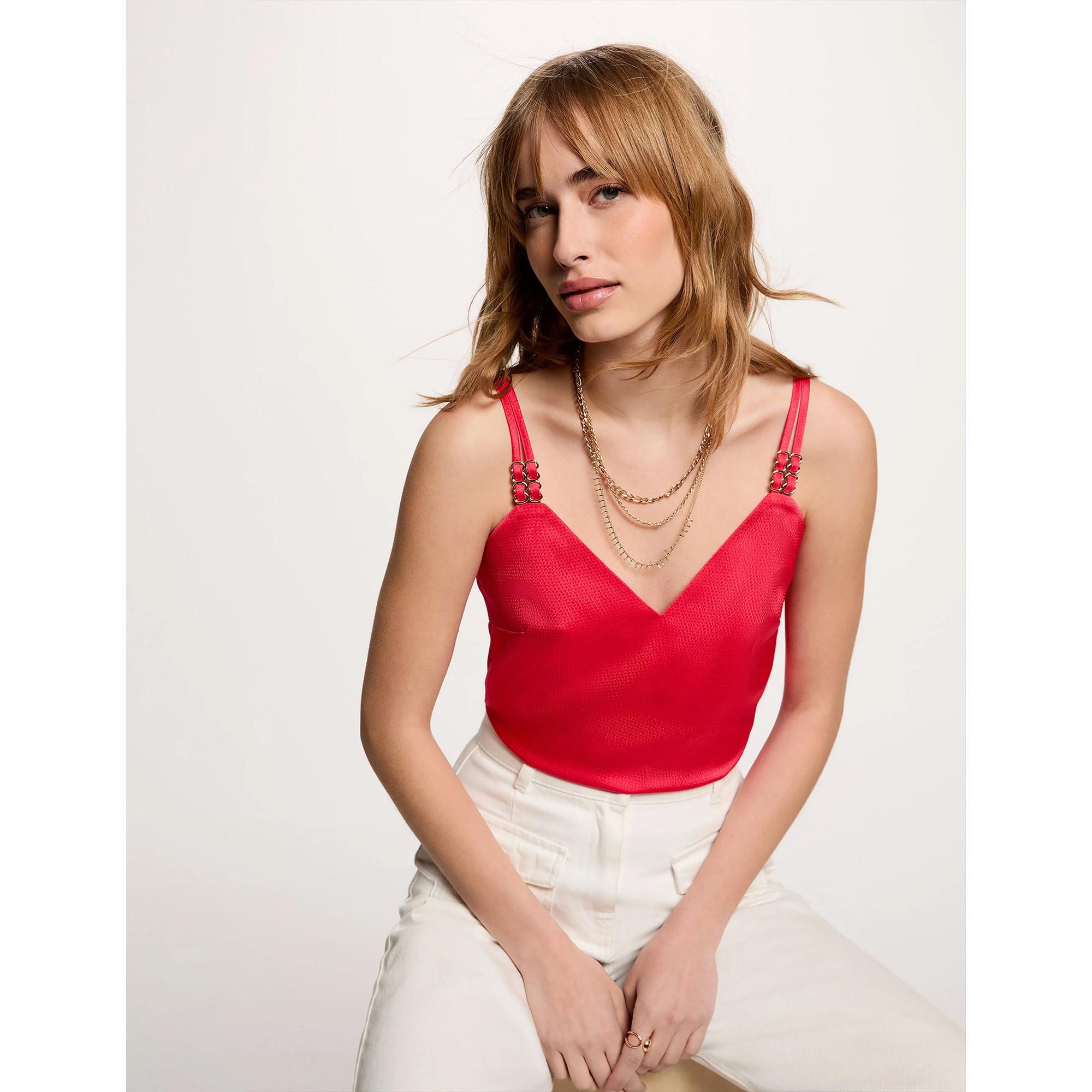 Le top Morgan a une coupe droite et un col en V. Il est en satin et possède des bretelles fines et ajustables avec des détails en bijoux.