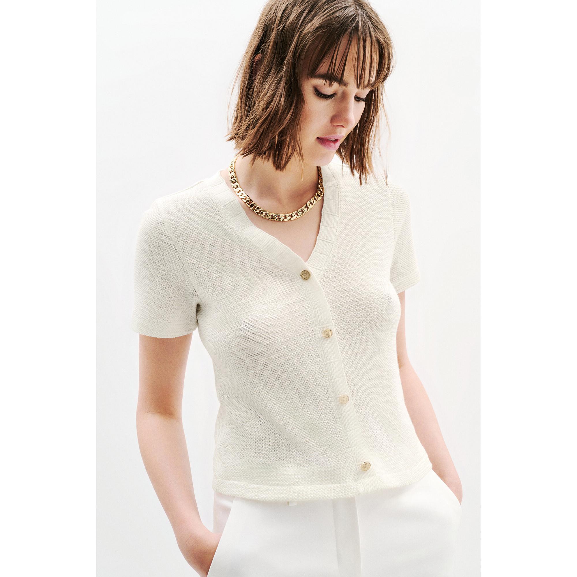 Ce t-shirt à manches courtes présente un design boutonné classique, offrant un ajout polyvalent à toute garde-robe. Le tricot texturé procure un look raffiné, adapté à diverses occasions.