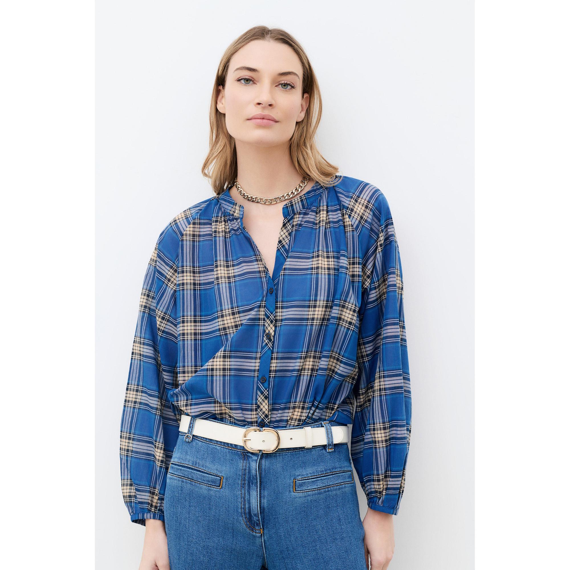 Ce chemisier à manches longues présente un motif à carreaux classique, offrant un ajout polyvalent à toute garde-robe. Le design comprend un décolleté froncé et une patte de boutonnage partielle, offrant une silhouette décontractée mais raffinée. Les manches sont terminées par des poignets élastiques, améliorant le confort et l'ajustement.