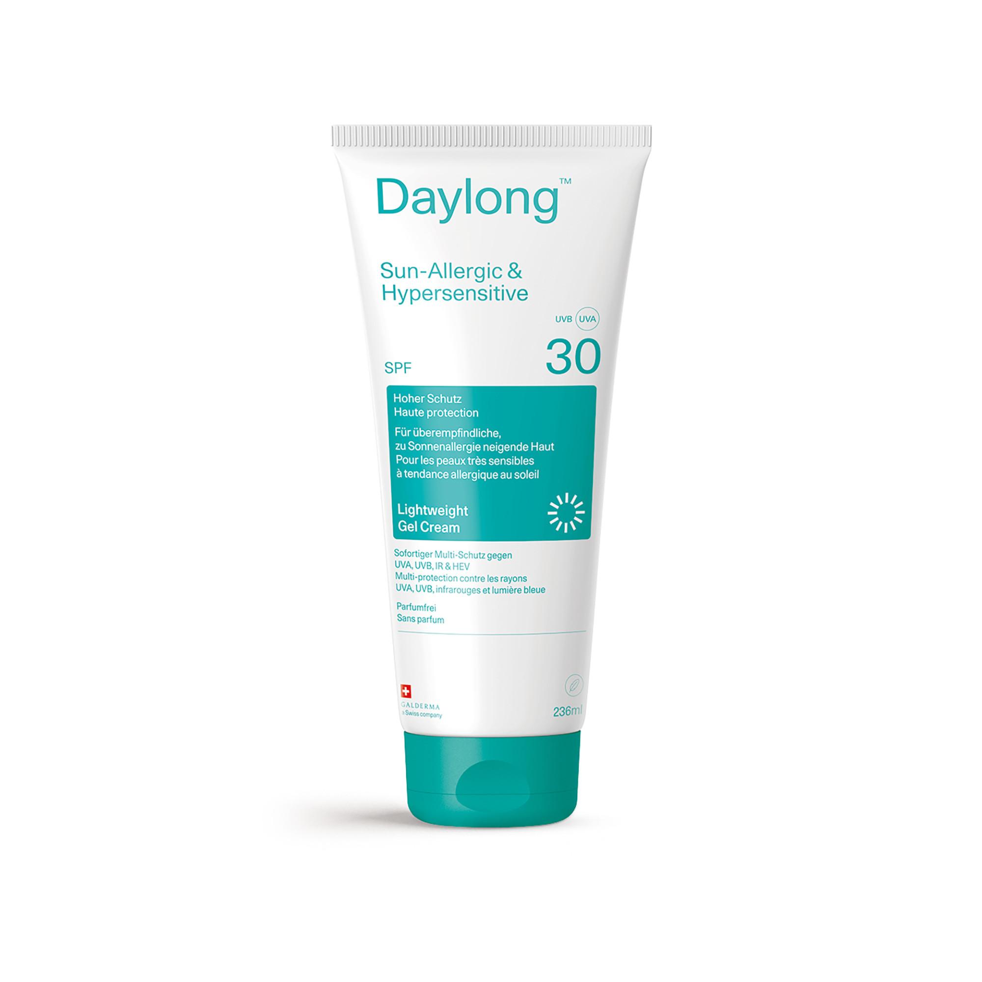 'La Sun-Allergic & Hypersensitive Gel-Crème légère SPF 30 : une protection solaire agréable pour les peaux très sensibles à tendance allergique au soleil. La gel-crème sans parfum est testée dermatologiquement et son efficacité est cliniquement prouvée. La texture ultralégère pénètre rapidement dans la peau, offrant ainsi une protection immédiate. Les filtres photostables à large spectre protègent efficacement la peau contre les rayons UVA, UVB et infrarouges ainsi que de la lumière bleue et préviennent ainsi le photovieillissement cutané et la pigmentation.