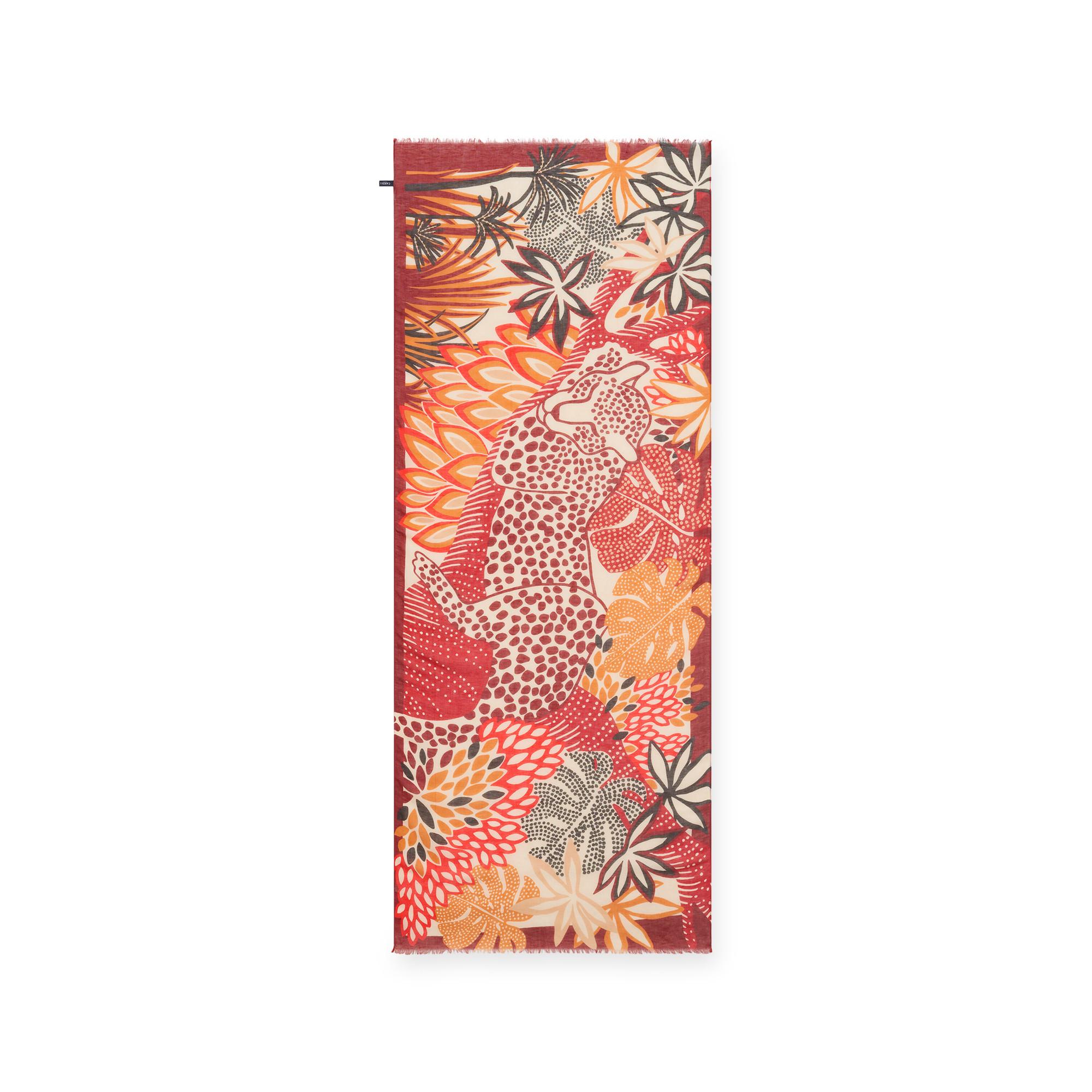Ce foulard arbore un imprimé léopard et floral éclatant, offrant un accessoire élégant pour diverses tenues. Le design combine des éléments naturels avec un motif animal, créant un look distinctif.