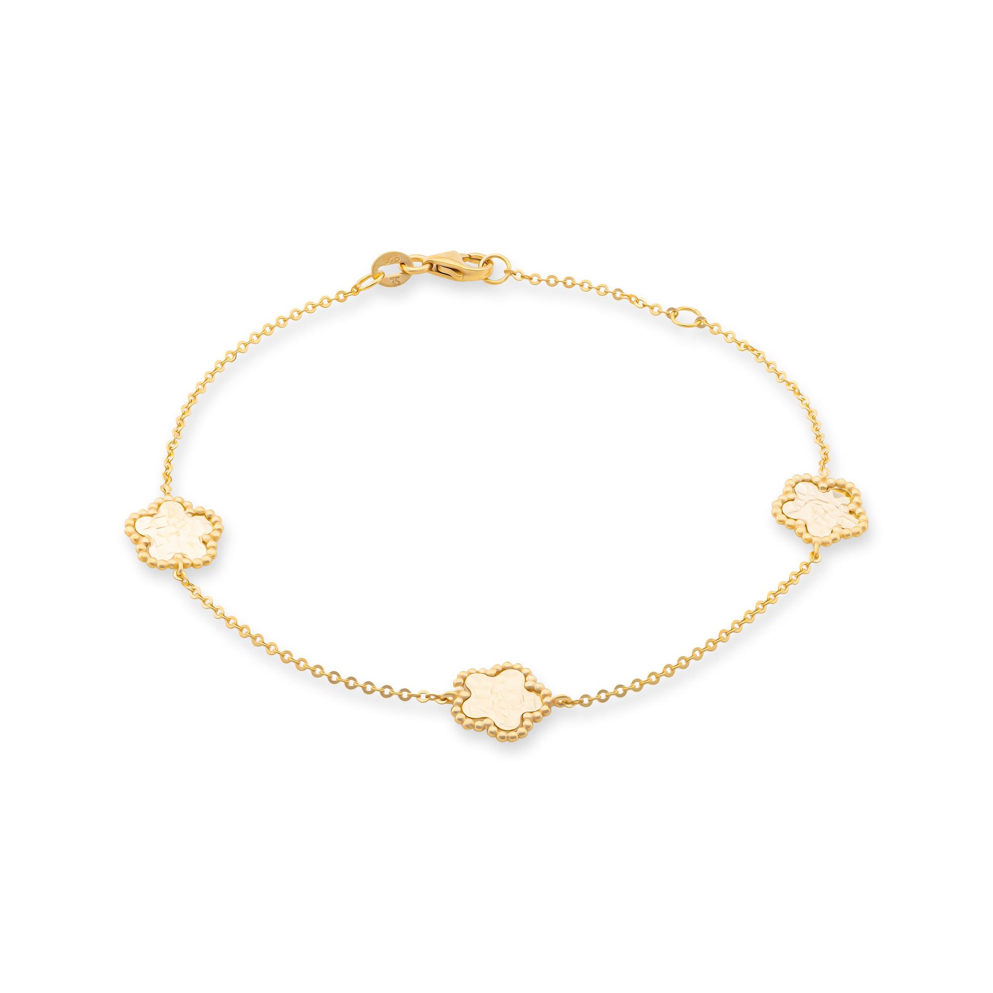 Ce bracelet de la collection N° 9 est un bijou délicat et féminin en or jaune 9 carats, avec des fleurs stylisées et un fermoir mousqueton. La chaînette est réglable en largeur.