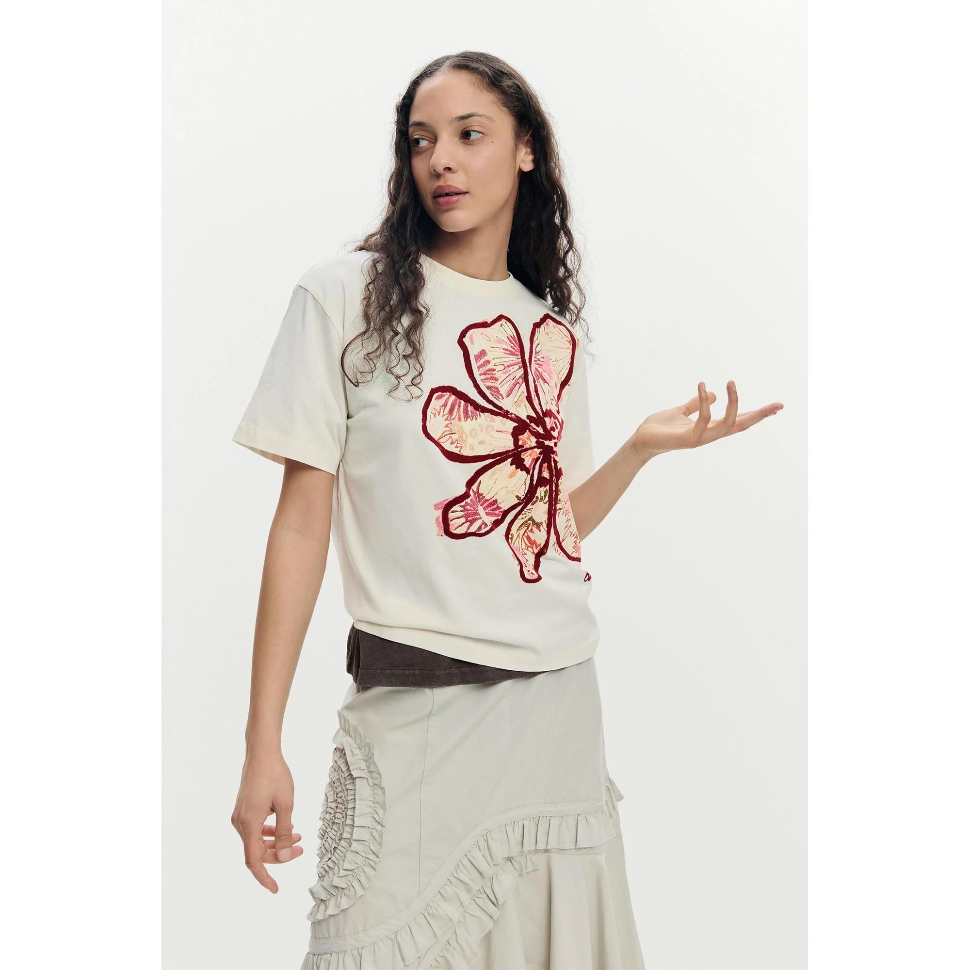Ce top à manches courtes présente un imprimé floral saisissant sur le devant, ajoutant une touche vibrante à n'importe quelle tenue. Le design est à la fois confortable et élégant, ce qui en fait un ajout polyvalent à une garde-robe.