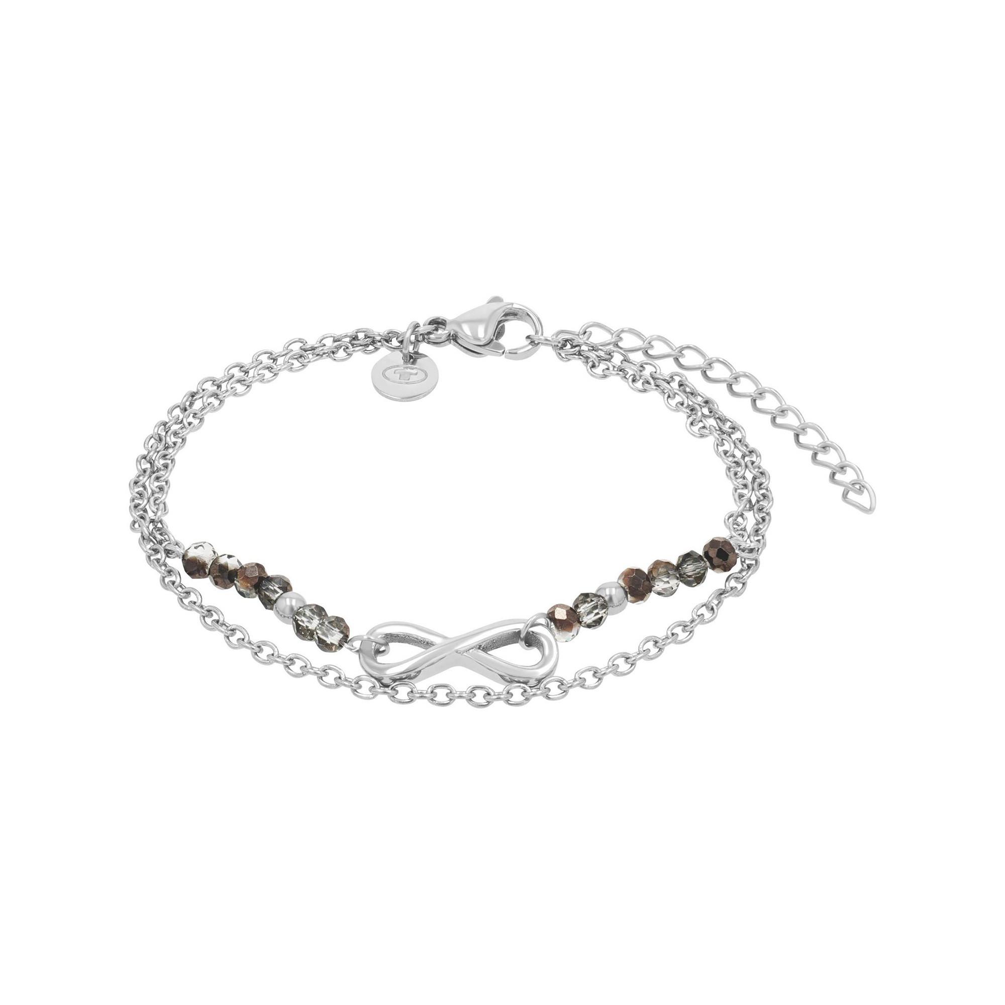 Ce bracelet élégant de TOM TAILOR associe de fines chaînes à des perles facettées aux tons bruns et gris délicatement scintillants. Le symbole de l’infini au centre apporte une touche raffinée et pleine de sens. Grâce à la longueur réglable, le bracelet s’adapte confortablement au poignet. Un bijou polyvalent, idéal pour compléter différents styles.