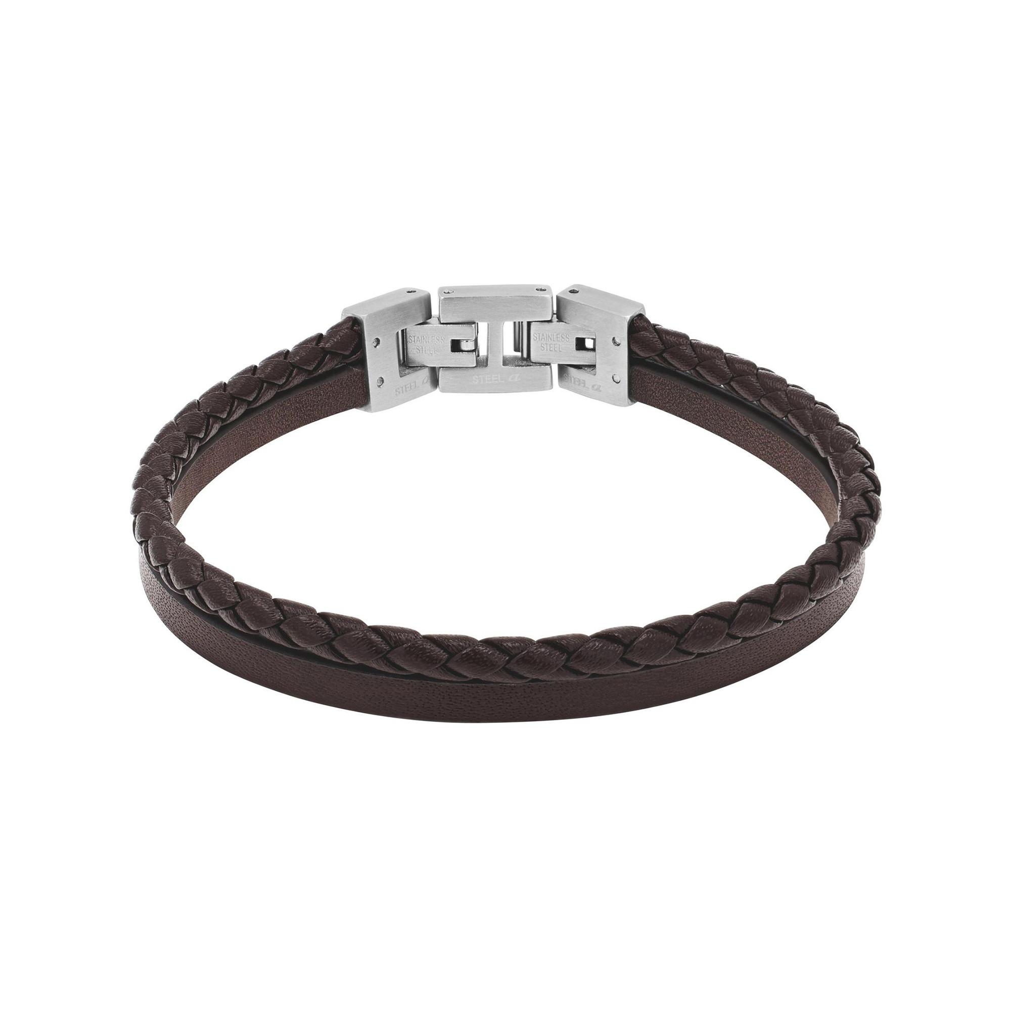 Ce bracelet épuré de TOM TAILOR associe deux lanières en cuir brun, lisses et tressées, dans un design intemporel. Sa teinte chaude lui confère une allure naturelle et facile à assortir. Le fermoir robuste en acier inoxydable garantit un maintien sûr et un grand confort. Un accessoire discret, idéal pour le quotidien ou pour compléter un style casual et urbain.