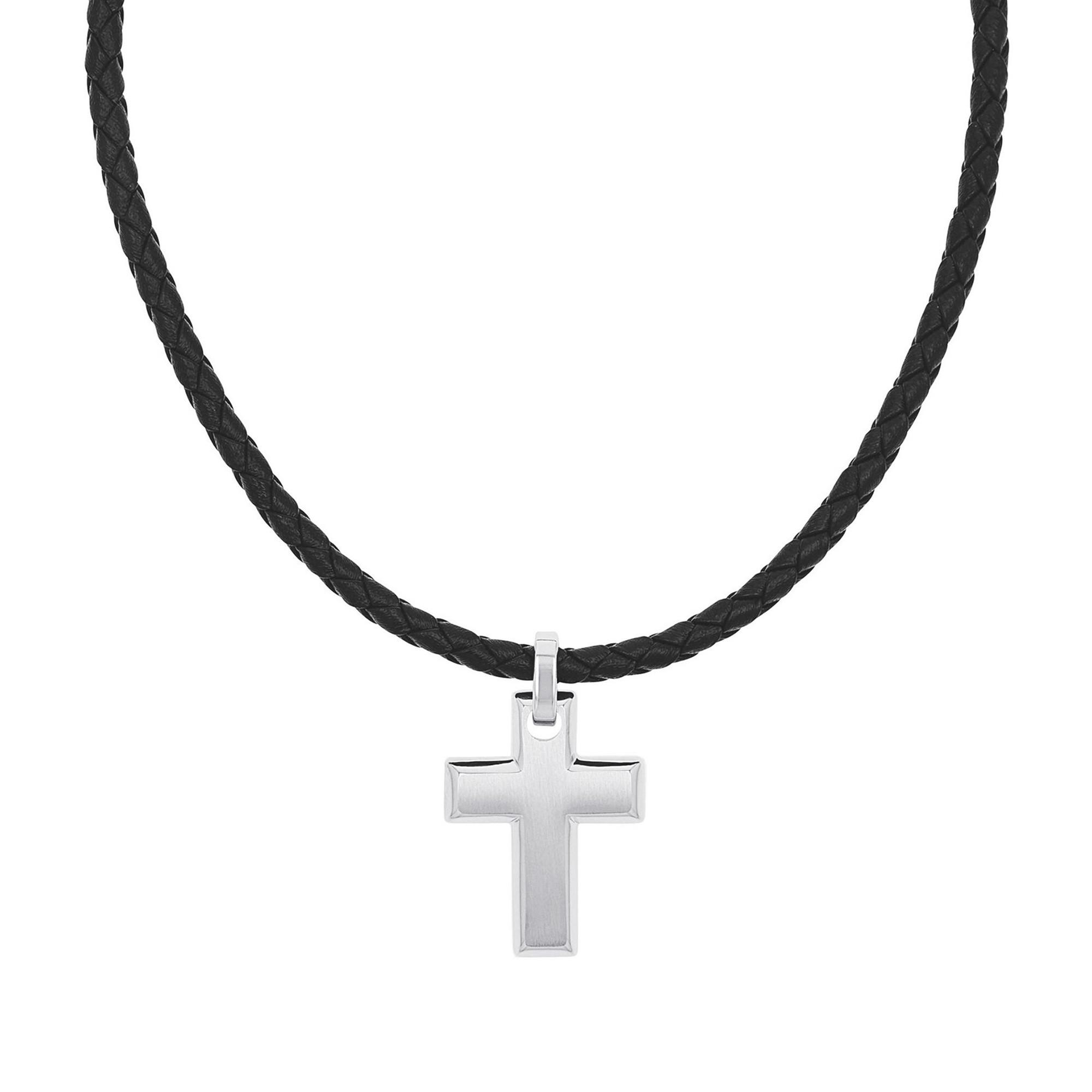 Ce collier TOM TAILOR séduit par son symbolisme fort et son design épuré. Le cordon tressé noir est complété par un pendentif croix en acier inoxydable au look sobre et moderne. La finition mate souligne le caractère intemporel du bijou et permet de multiples associations. Un accessoire expressif pour le quotidien et les loisirs.