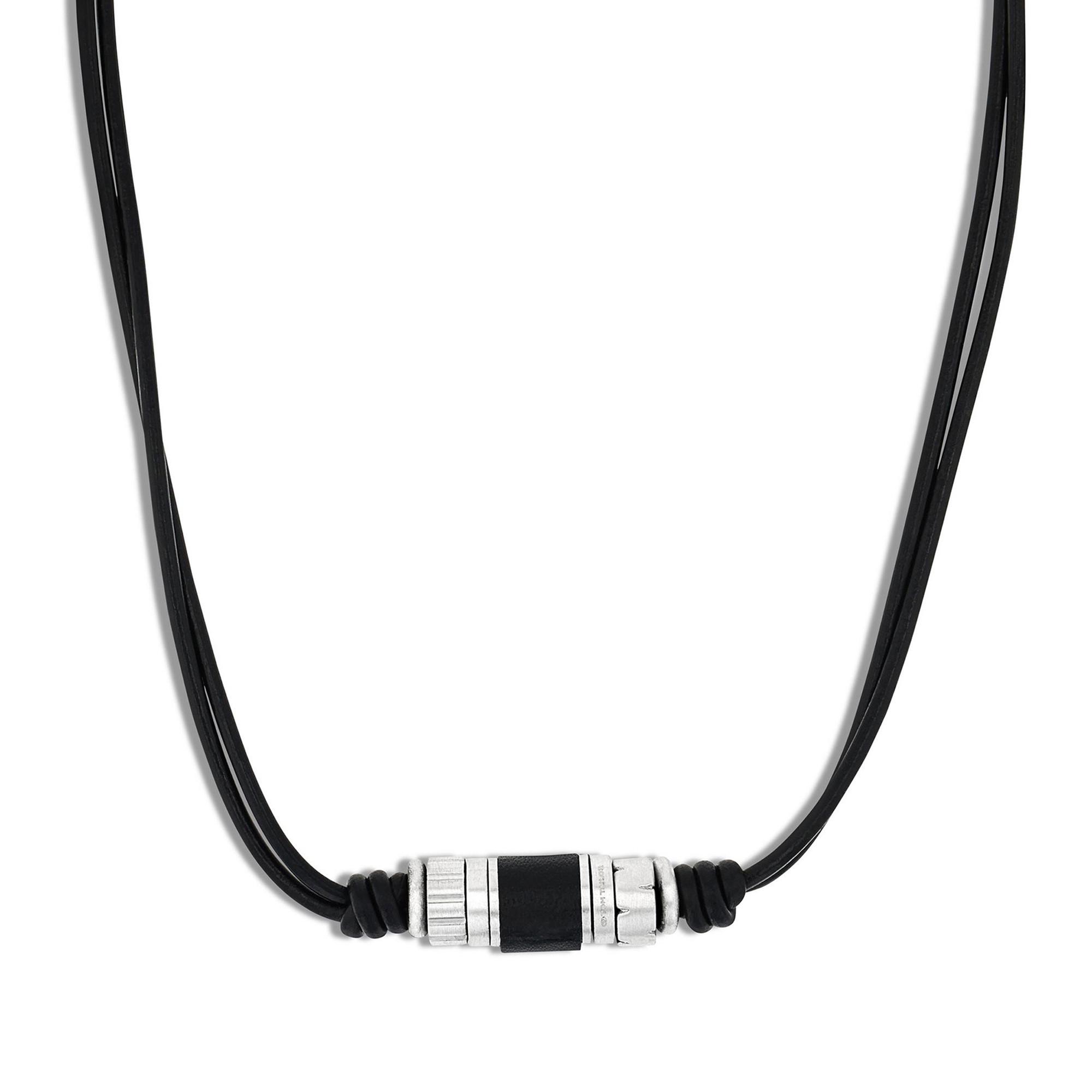Ce collier TOM TAILOR séduit par son style masculin affirmé et sa combinaison de matériaux de qualité. Les deux cordons noirs parallèles convergent vers un cylindre central en acier inoxydable aux détails structurés. Les accents foncés renforcent l’allure moderne et urbaine du bijou. Un accessoire polyvalent, parfait pour le quotidien et les loisirs.