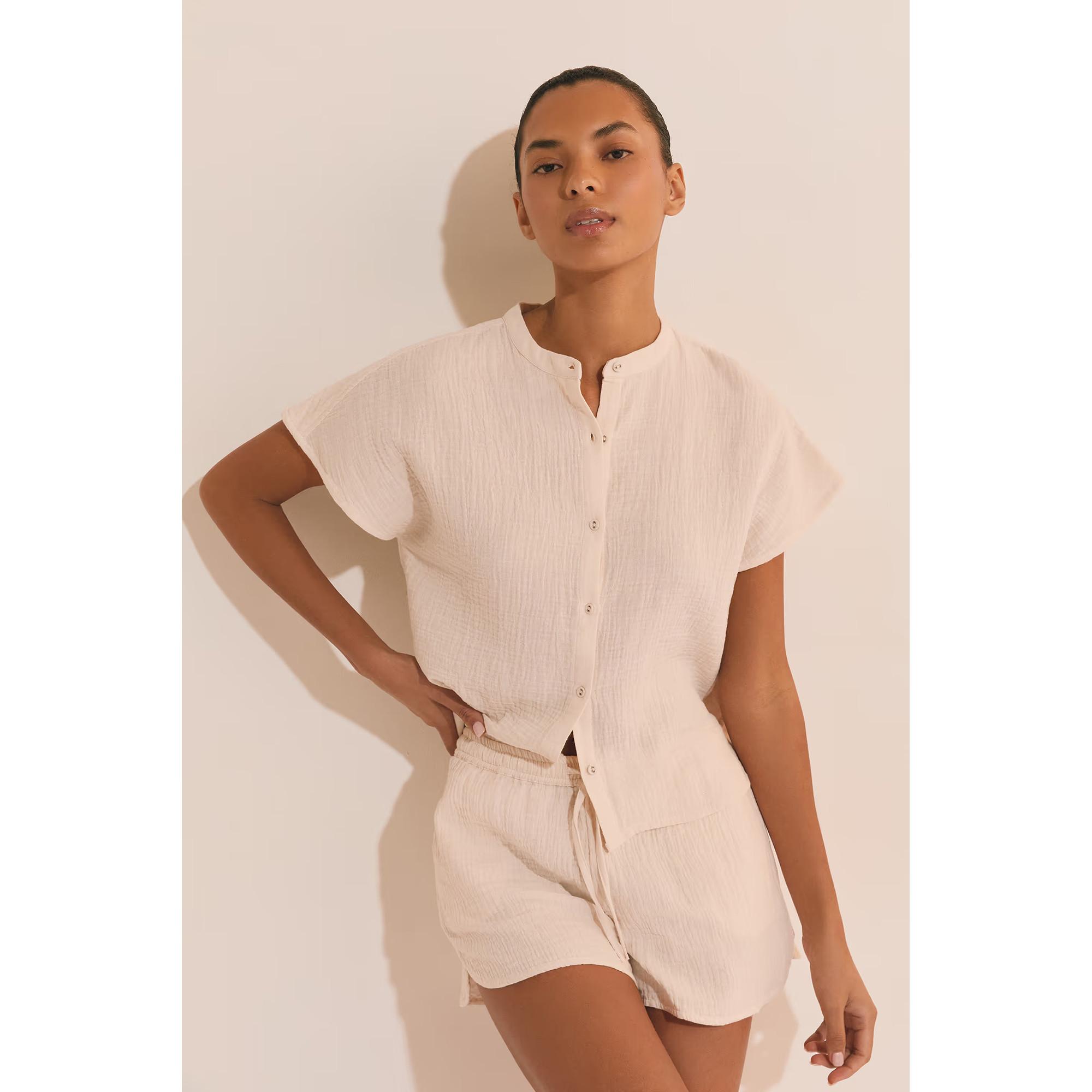 Cette chemise à manches courtes présente une coupe décontractée et un col montant, offrant une option confortable et élégante pour diverses occasions. La patte de boutonnage s'étend sur le devant, permettant un ajustement de la couverture et une facilité d'utilisation. La texture froissée du tissu ajoute un élément visuel et tactile unique au design.