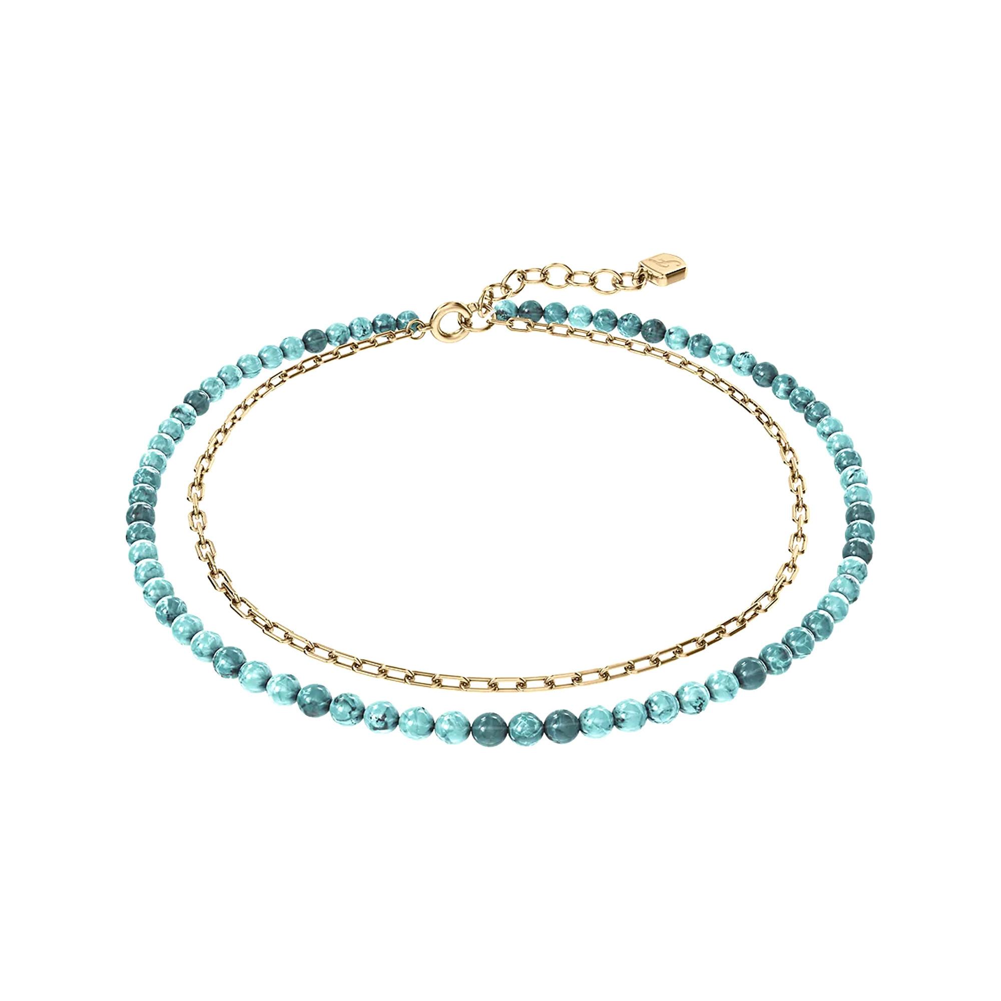 Ce bracelet de cheville multi‑rangs associe une chaîne polie de couleur or à des perles en acrylique turquoise pour un rendu élégant et estival. Sa construction délicate lui confère une légèreté raffinée et un style sans effort. Le fermoir mousqueton garantit un maintien sûr et un port confortable. Un accessoire chic pour les journées ensoleillées.