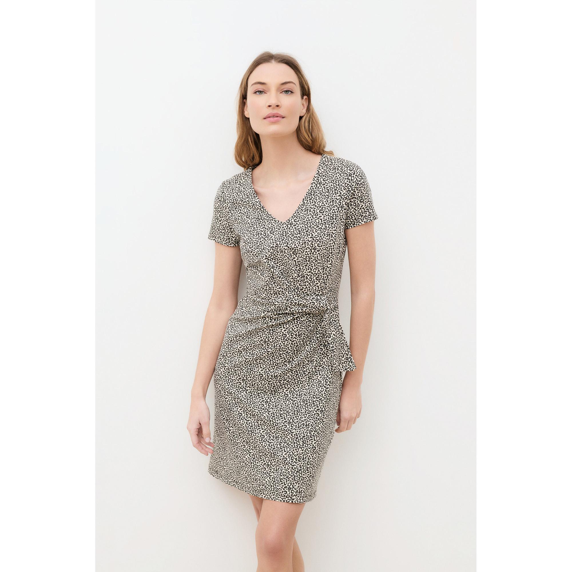 Cette robe courte à manches courtes présente un décolleté en V flatteur et un imprimé all-over élégant. La robe est conçue avec un détail à nouer à la taille, permettant un ajustement réglable et confortable. Son design polyvalent la rend adaptée à diverses occasions, offrant un look chic et sans effort.