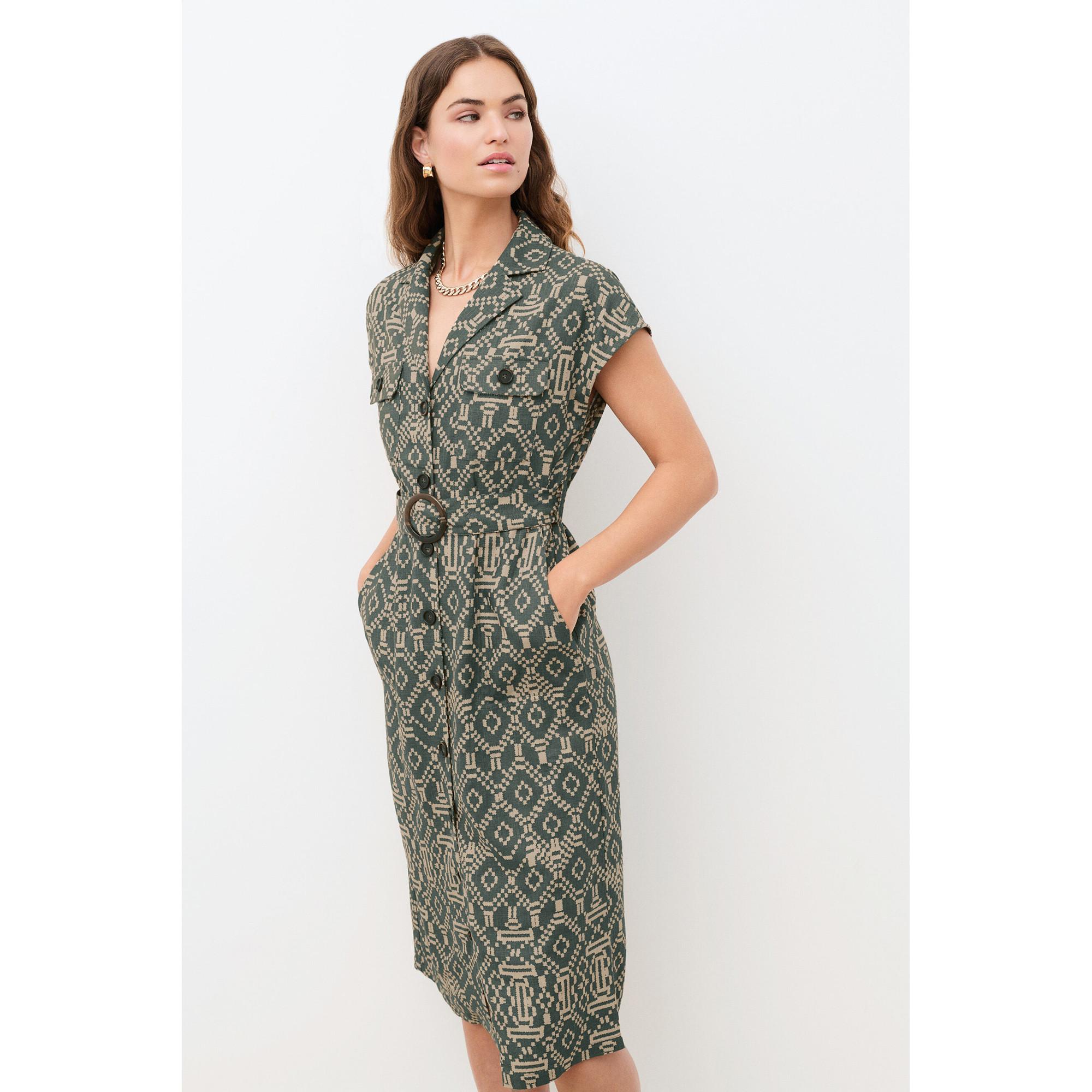 Cette robe chemise arbore un motif géométrique captivant, offrant un look élégant et contemporain. Le design comprend un col classique et des manches courtes, ce qui la rend adaptée à diverses occasions. Une ceinture assortie cintre la taille, créant une silhouette flatteuse.
