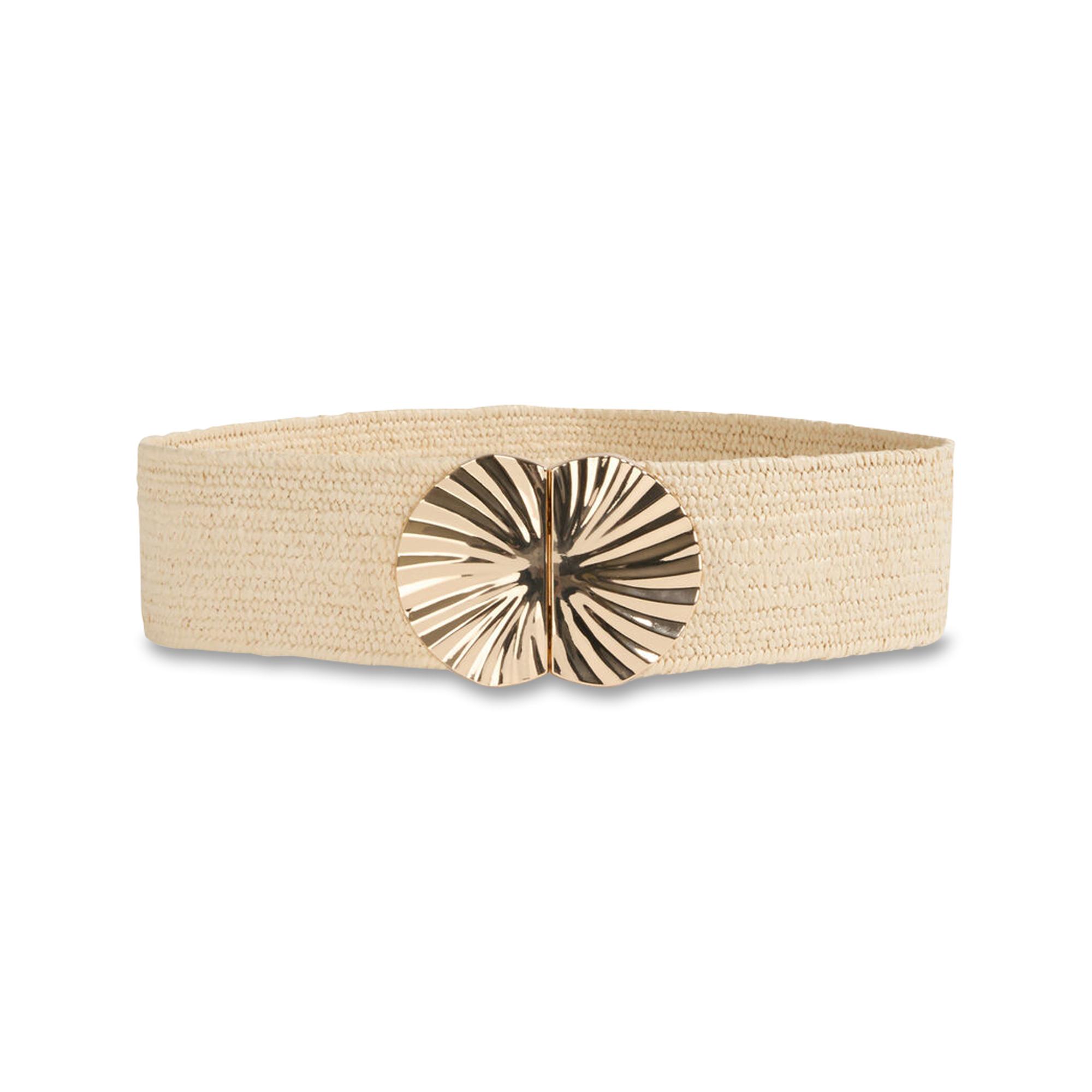 Cette ceinture en raphia tressé présente un design large et une boucle dorée distinctive. La boucle est composée de deux éléments semi-circulaires avec un motif texturé en forme d'éventail, créant un point focal saisissant. La texture naturelle du raphia ajoute une touche organique et élégante à toute tenue.