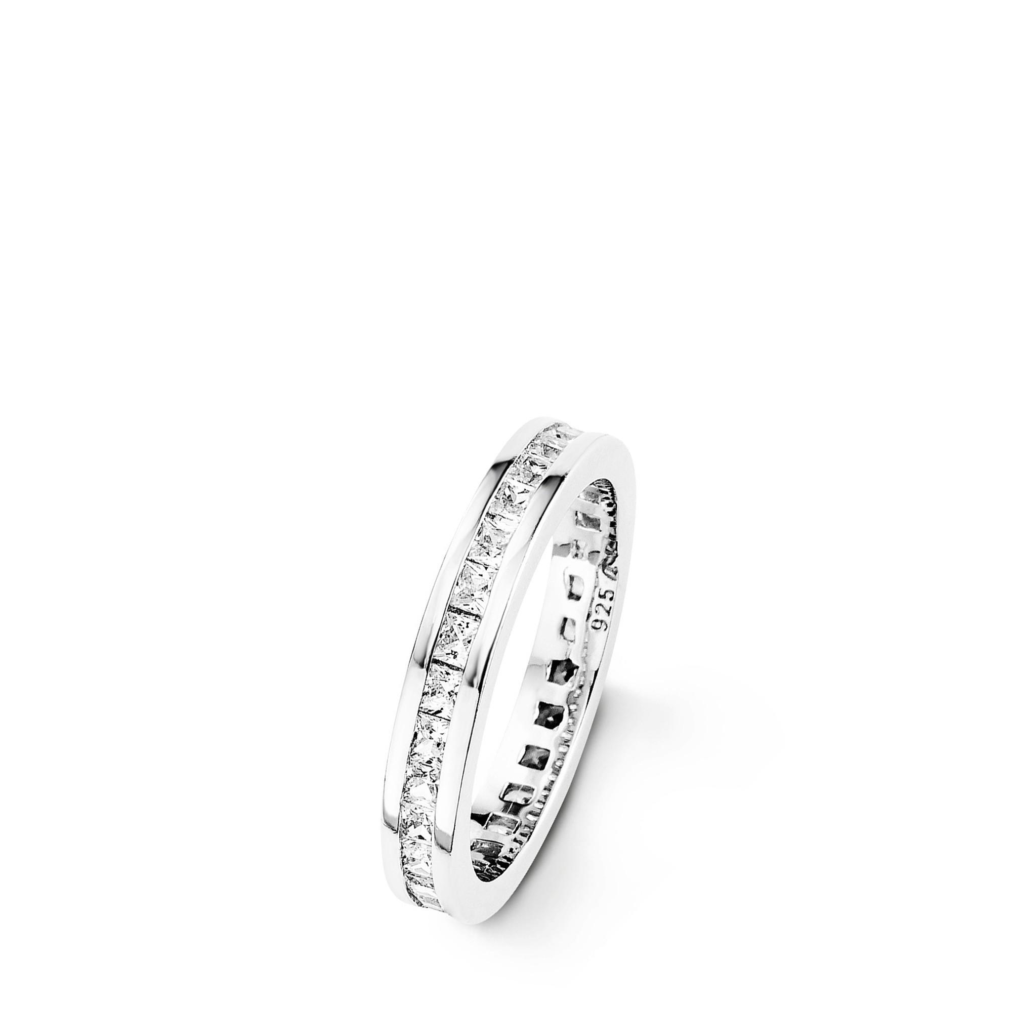 Cette bague pour femme délicate de 3 mm rayonne non seulement en argent sterling 925 poli, mais elle est également ornée de zircons étincelants tout autour. Quelle que soit la façon dont on tourne le bijou, on peut toujours voir et admirer l'étincelle. Une couche de rhodium protège la bague d'un noircissement inesthétique et elle est également bien tolérée par la peau. La merveille étincelante peut être portée en particulier sur l'annulaire ou le majeur.