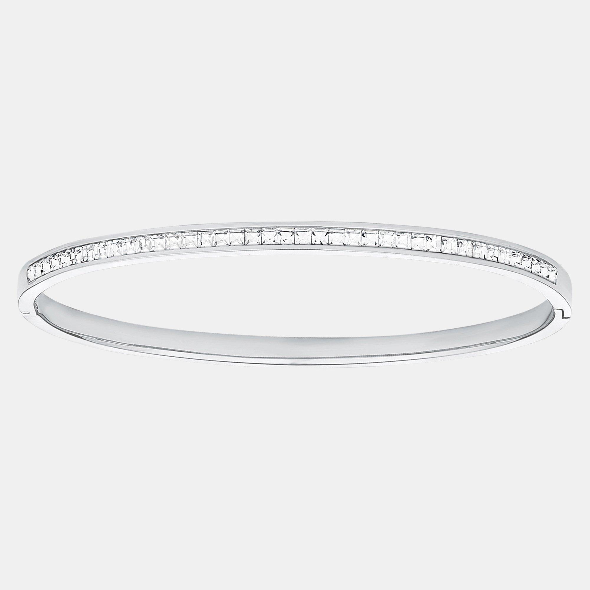 Ce bracelet à la mode en acier inoxydable est un véritable accroche-regard en raison de la finesse des cristaux Swarovski® blancs. Le bijou d'une largeur de 4 mm a un diamètre de 6,2 cm et est un accessoire parfait pour toutes les femmes en raison de sa surface brillante, et il se ferme facilement avec une fermeture à broche.