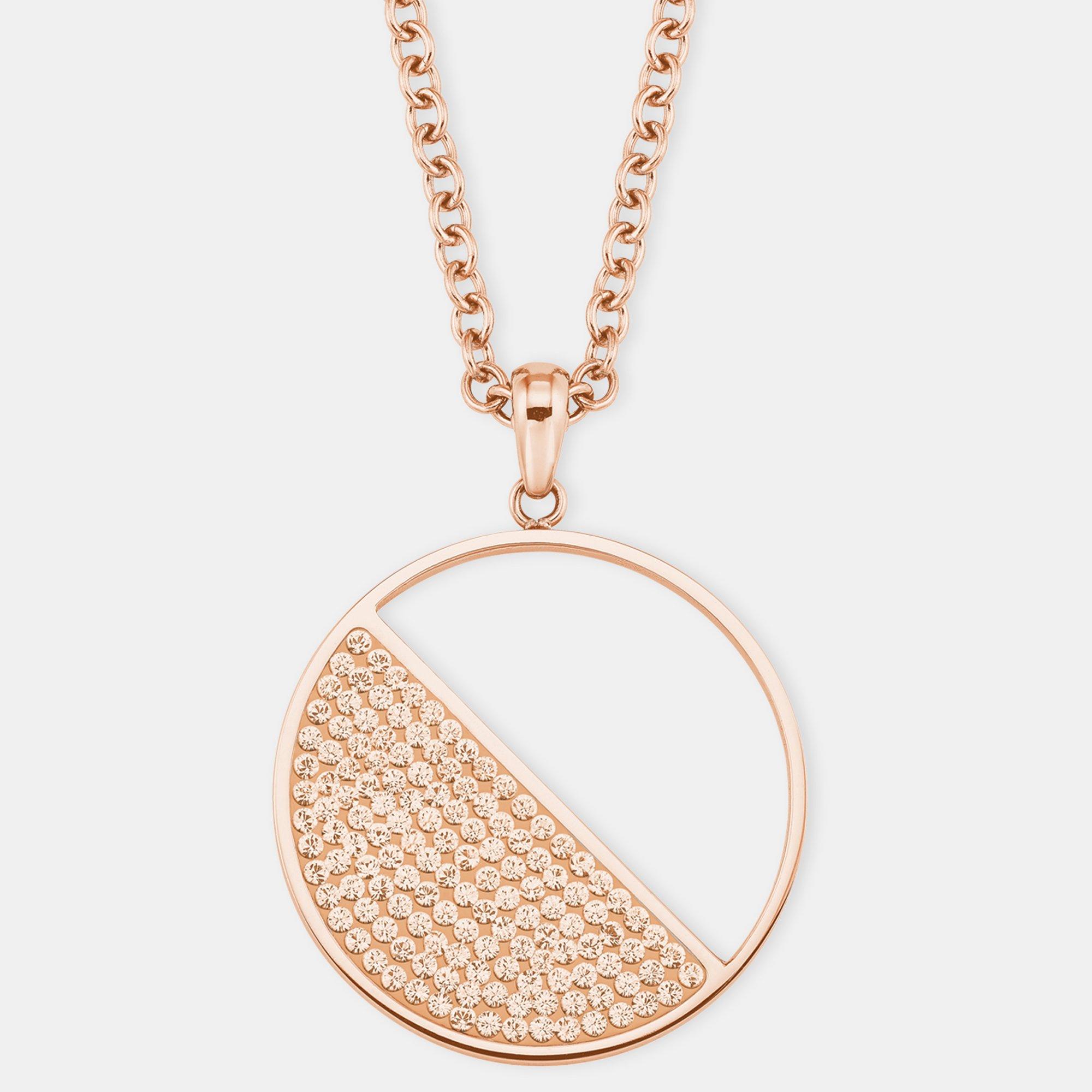 Ce pendentif rond recouvert de cristaux Swarovski® étincelants est accroché à une chaîne maille forçat ronde à longueur réglable (chaîne d'extension de 42 + 3 cm). En termes de couleur, les cristaux rayonnants couleur pêche brillante s'harmonisent parfaitement avec l'acier inoxydable rose. Un vrai look incroyable.