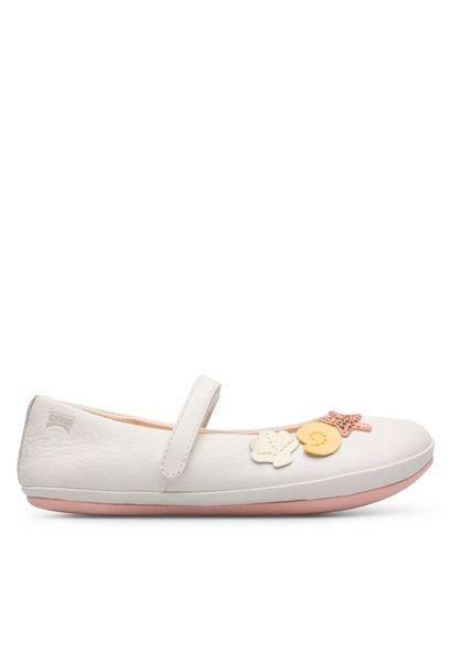 Ballerine TWINS blanche pour fille. En cuir 100 % avec velcro et fantaisies latérales. Semelle rose 100 % caoutchouc.