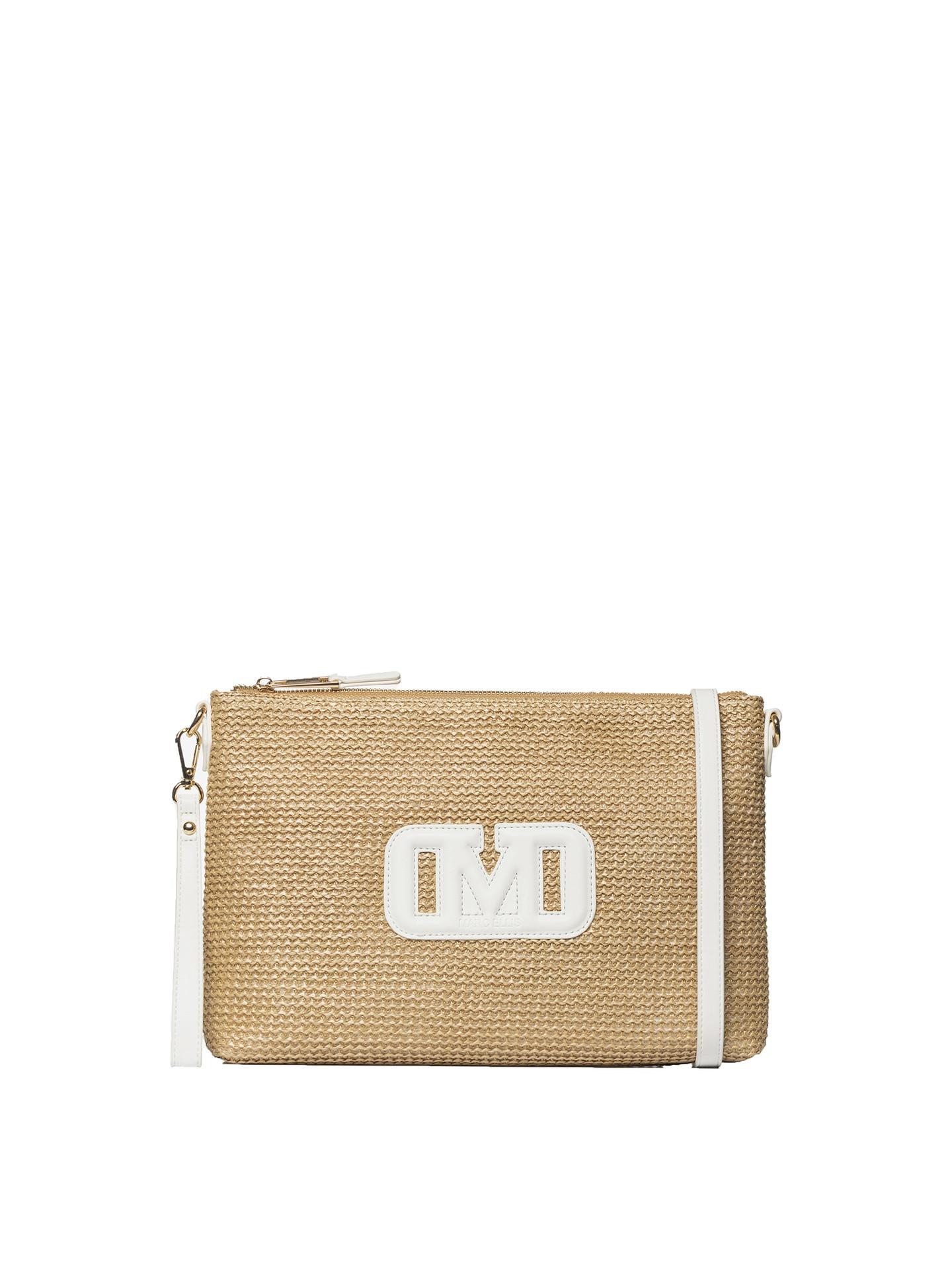 Ce sac à main présente un design tressé avec un logo proéminent sur le devant, offrant un accessoire élégant pour diverses occasions. Il comprend une dragonne détachable et une bandoulière pour des options de transport polyvalentes.