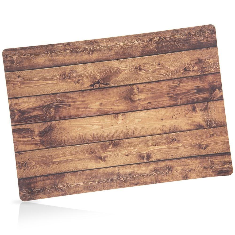 Tapis de cuisine rectangulaire en plastique imitation bois. Crée un joli fond pour la vaisselle et les couverts.
