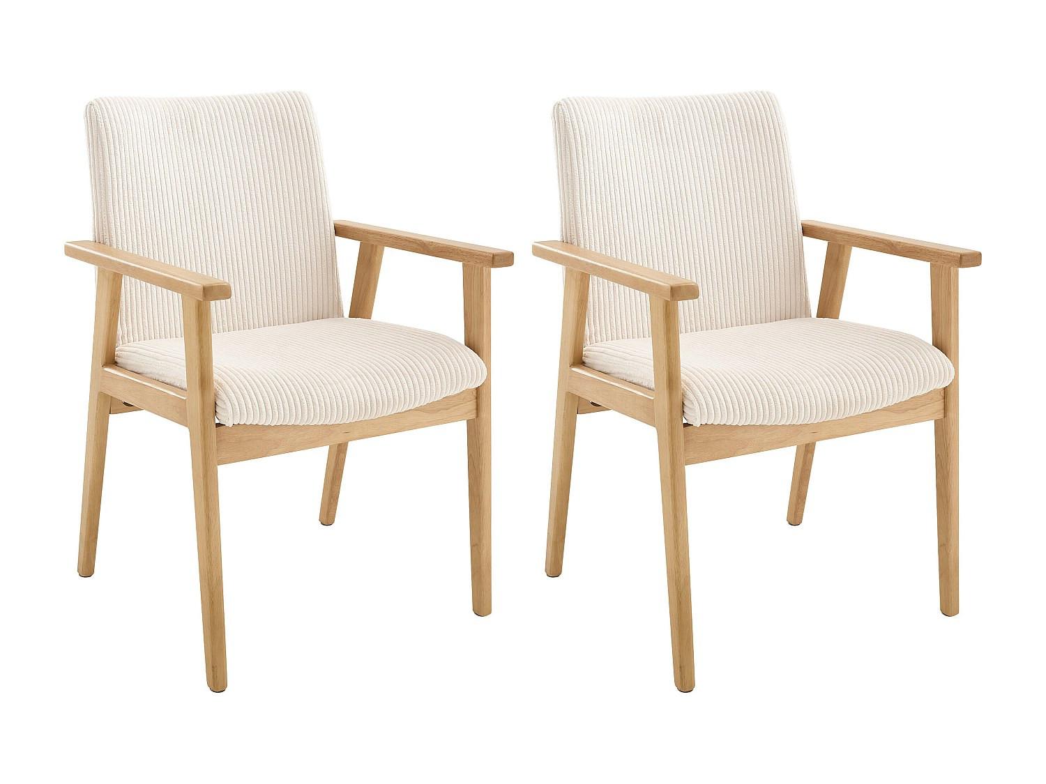 Dotées d'accoudoirs pour un confort optimal, elles séduisent par leur revêtement en velours côtelé crème et leur structure en bois d'hévéa naturel. Cette combinaison de matières et de couleurs crée une ambiance chaleureuse et lumineuse.