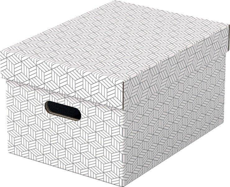 HOME - Aufbewahrungsboxen Elegante und moderne Aufbewahrungsboxen aus Wellpappe mit abnehmbarem Deckel, ideal zum Verpacken von Geschenken oder zum schnellen Verstauen von Utensilien zu Hause. Set mit drei Boxen der gleichen Größe, zur Aufbewahrung in Regalen oder in kubischen, offenen Möbeln, um kleinere Gegenstände wie Fotos und persönliche Dokumente ordentlich und leicht auffindbar aufzubewahren. Mit etwas Geschenkband können Sie mit diesen Boxen auch ein Geschenk verpacken! Nach dem Öffnen kann die Box dann vom Empfänger für die Aufbewahrung zu Hause wiederverwendet werden und bietet somit 2 Geschenke in einem. Hergestellt aus stabiler, 100 % recycelter und 100 % recycelbarer FSC-zertifizierter Wellpappe. Die abwischbare Oberfläche ist mit einem zweifarbigen, geometrischen Design versehen, um Ihrer Aufbewahrung Stil zu verleihen. Wird flach verpackt geliefert und lässt sich schnell und einfach aufbauen. Die robuste Konstruktion mit doppelten Seitenwänden und Boden sorgt für Stabilität und Langlebigkeit. Set bestehend aus drei kleinen dekorativen Aufbewahrungsboxen aus Pappe mit einem eleganten, modernen und zweifarbigen geometrischen Design. Die dezenten Farben passen zu jeder Inneneinrichtung, ideal als Geschenkbox oder zur Aufbewahrung von Unterlagen, Fotos und anderen Utensilien Jede Aufbewahrungsbox verfügt über einen abnehmbaren Deckel, um den Inhalt der Box zu verdecken und zu schützen. Sie kann auch als nachhaltige Geschenkverpackung verwendet und vom Empfänger zur Aufbewahrung zu Hause genutzt werden Wird flach verpackt geliefert und ist schnell und einfach aufzubauen. Die doppelten Seitenwände sorgen zusätzlich für Stabilität. Können eigenständig genutzt werden oder dienen als Stauraum in Regalen Hergestellt aus 100 % recycelter und 100 % recycelbarer, FSC®-zertifizierter Wellpappe mit beschichteter, abwischbarer Oberfläche und plastikfreier Verpackung Lieferumfang: 3 x Esselte Home Aufbewahrungsboxen mit Deckel, Klein, Abmessungen (B x H x T): 200 x 150 x 255 mm, Gewicht: 336 g, Geometrisches Design, Weiß, 628280 Plastikfreie Verpackung aus 100 % recyceltem und 100 % recycelbarem Material
