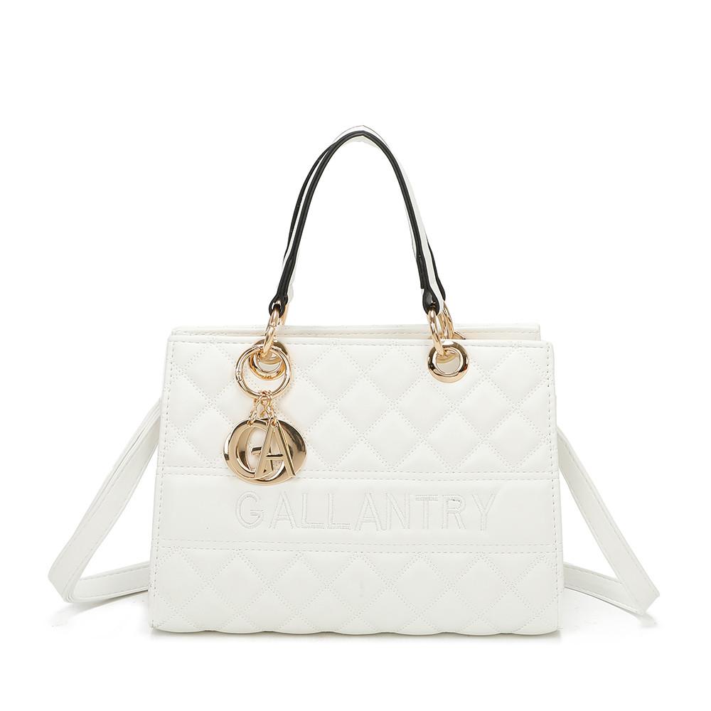 Ce sac à main élégant présente un design matelassé et une finition en similicuir brillant, ce qui en fait un accessoire stylé pour diverses occasions. Le sac est orné d'un gaufrage "GALLANTRY" proéminent sur le devant, ajoutant une touche distinctive. Il comprend un charm décoratif avec l'initiale de la marque, rehaussant son attrait sophistiqué. L'intérieur offre un rangement pratique pour les essentiels quotidiens, le rendant à la fois mode et fonctionnel.