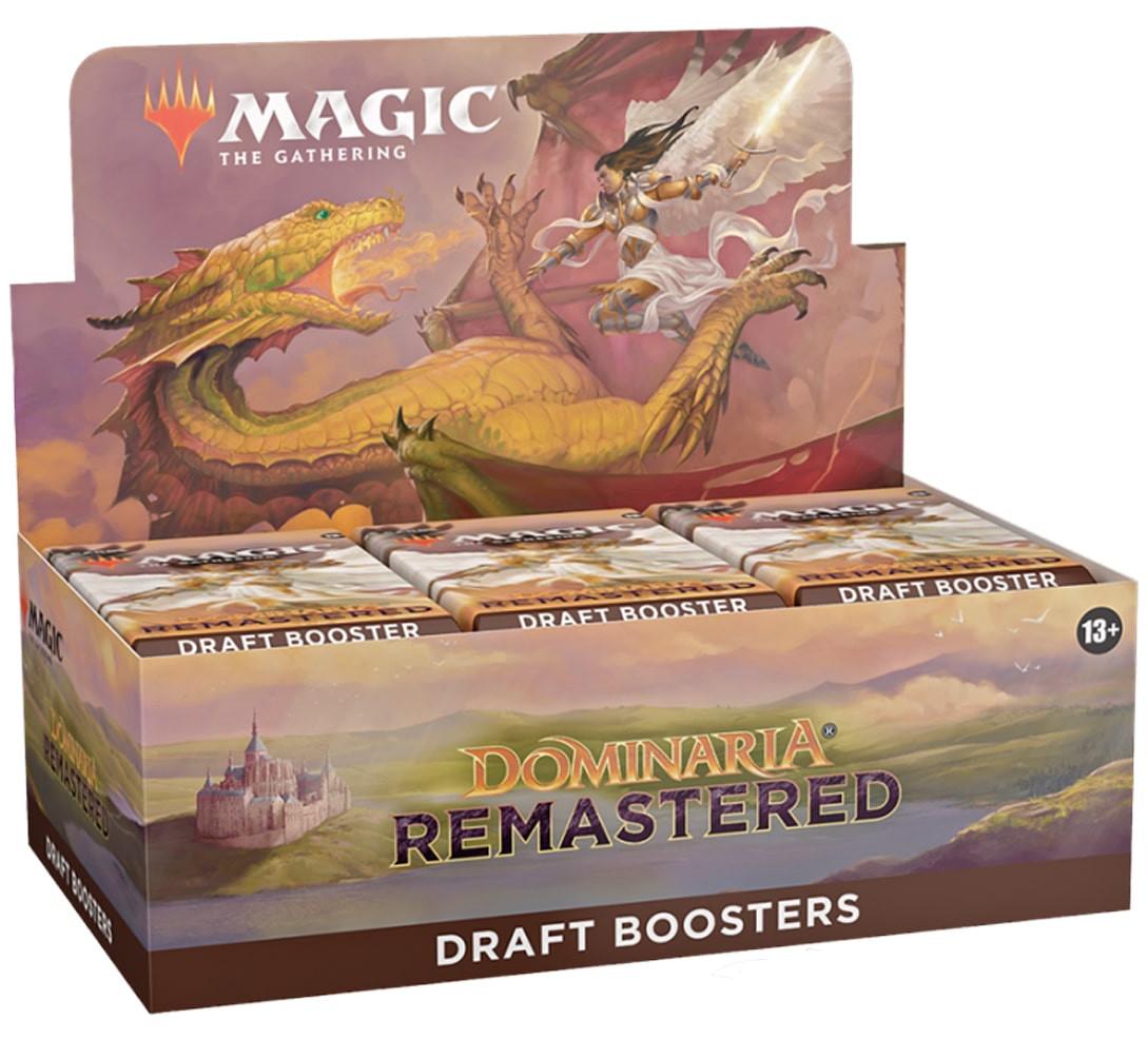 Ein Dominaria Remastered Draft-Booster-Display enthält 36 Dominaria Remastered Draft-Booster. Jeder Draft-Booster enthält 15 Karten und 1 Spielstein-/Werbekarte, darunter 1 Karte der Seltenheit selten oder höher, 2-4 nicht ganz so häufige Karten, 9-11 häufige Karten und 1 Länderkarte mit Retro-Kartenrand. In 33 % der Booster ersetzt eine traditionelle Foilkarte zufälliger Seltenheit eine häufige Karte.