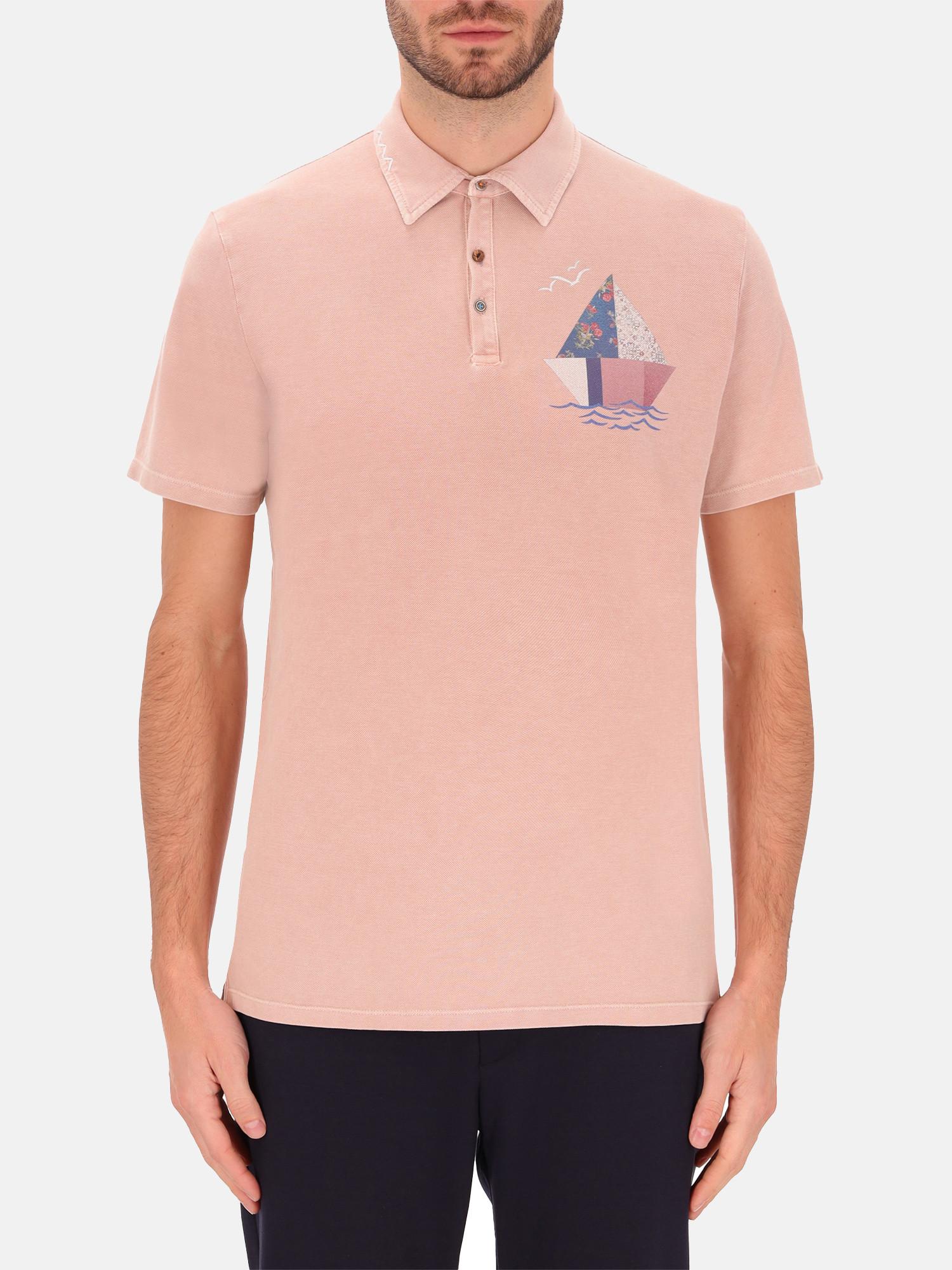Ce polo à manches courtes est confectionné en tissu piqué et présente un col voile. Il arbore un lavage marbré avec un effet vieilli sur une broderie faite à la main et un imprimé bateau. La fermeture polo comprend des boutonnières et des boutons fabriqués à partir de divers matériaux.