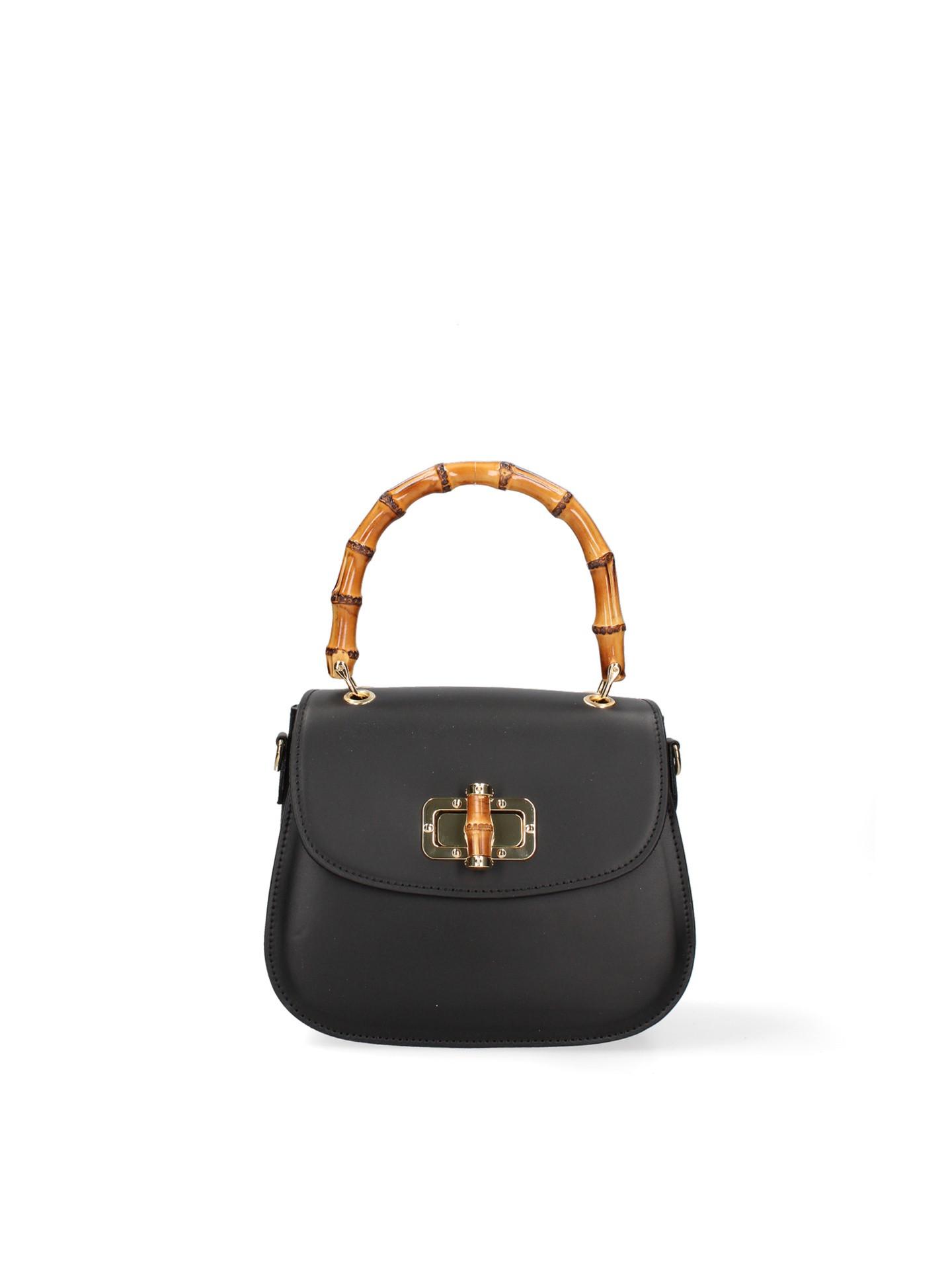 Cet élégant sac à main, fabriqué en Italie, est doté d'une poignée distinctive en bambou, ajoutant une touche de sophistication naturelle à son design. Le sac est sécurisé par un élégant fermoir doré, complétant sa silhouette classique. Fabriqué en cuir véritable, il offre un accessoire intemporel pour diverses occasions.