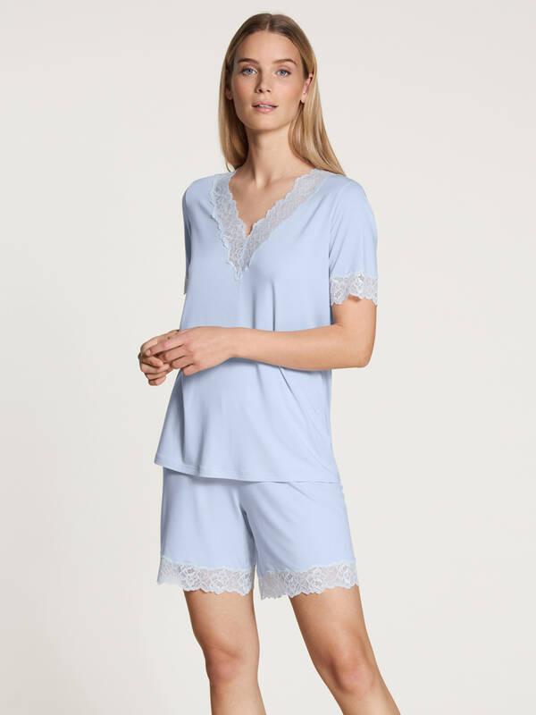 L'ensemble pyjama Elegant Dreams offre une option confortable et élégante pour les vêtements de détente. Le t-shirt en V et le short ont une coupe aérée, assurant le confort. Une dentelle délicate orne l'encolure, les ourlets des manches et des jambes, ajoutant une touche élégante. Le short est doté d'une ceinture élastique pour un ajustement sûr et confortable.