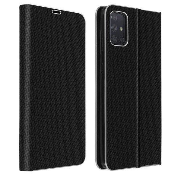 Housse folio pour Samsung Galaxy A71. Protection intégrale à fermeture magnétique. Doublure Soft-touch. Support vidéo et rangement carte intégré au clapet. Revêtement élégant en éco-cuir effet carbone. Fonctionnalités accessibles, coque sur-mesure souple